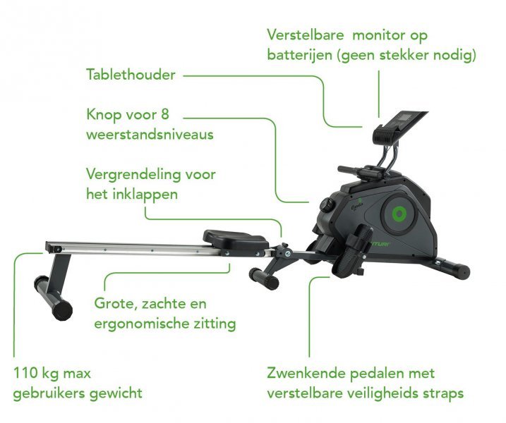 Manuálně nastavitelný odpor v 8 stupních je vhodný pro začínající i zkušené veslaře. Zafixování chodidel na nášlapech přes řemínky na suchý zip zaručí maximální stabilitu a pohodlnost při tréninku na veslovacím trenažéru!