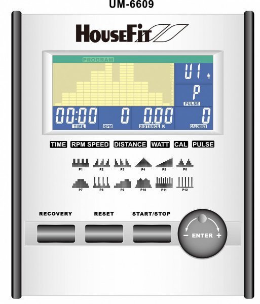 Rotoped Housefit TIRO 70 je vybaven přehledným a snadno ovladatelným barevně podsvíceným LCD displejem se snadným ovládáním. Zobrazuje běžné hodnoty v tréninku jako je čas, aktuální rychlost, ujetou vzdálenost, frekvenci otáček (RPM), spálené kalorie a zátěž. Na displeji si můžete předvolit požadované hodnoty. Model disponuje 12 přednastavenými programy a HRC programy + manuální režim.