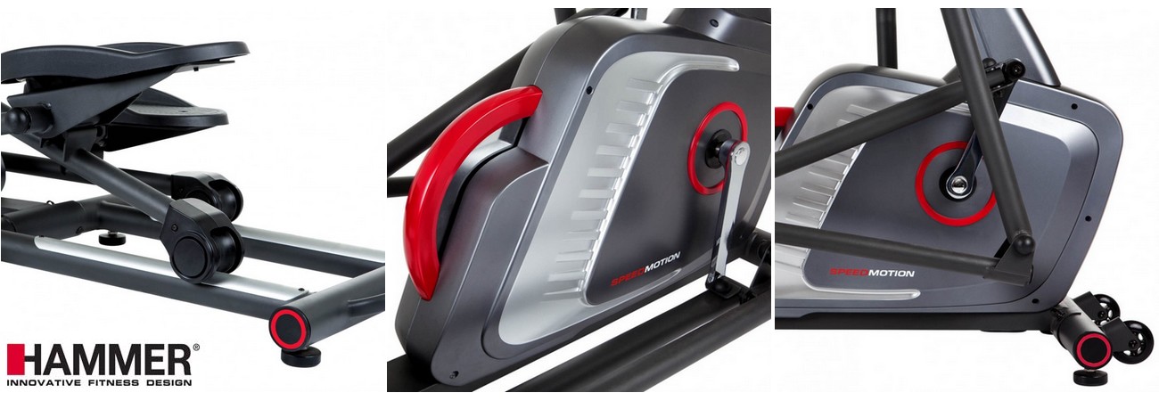 HAMMER Speed-Motion BT je špičkový stroj s masivní konstrukci. Trenažér vám umožňuje trénovat horní i dolní končetiny zároveň, aniž byste tím nijak nezatěžovali klouby a záda. Setrvačník v přední části stroje a jeho ergonomie budou vyhovovat jak menším, tak i větším postavám. Krok s délkou 43 cm a roztečí pedálů 14 cm nabízí přirozený pohyb.