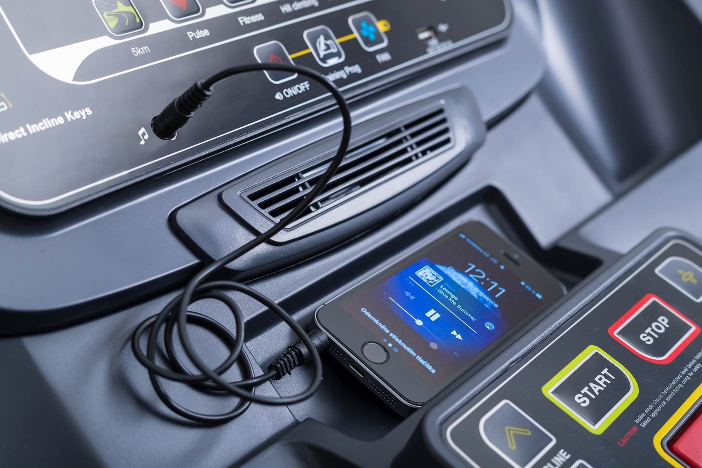 Trenažér má zabudované reproduktory pro připojení MP3, smartphonu nebo iPodu. Pro připojení vašeho telefonu k MP3 je součástí balení kabel (3,5 jack). Na předním panelu ovládacího počítače najdete i nabíjecí USB konektor. Nestane se vám tak, že se vám při tréninku vybije váš mobilní telefon nebo tablet.