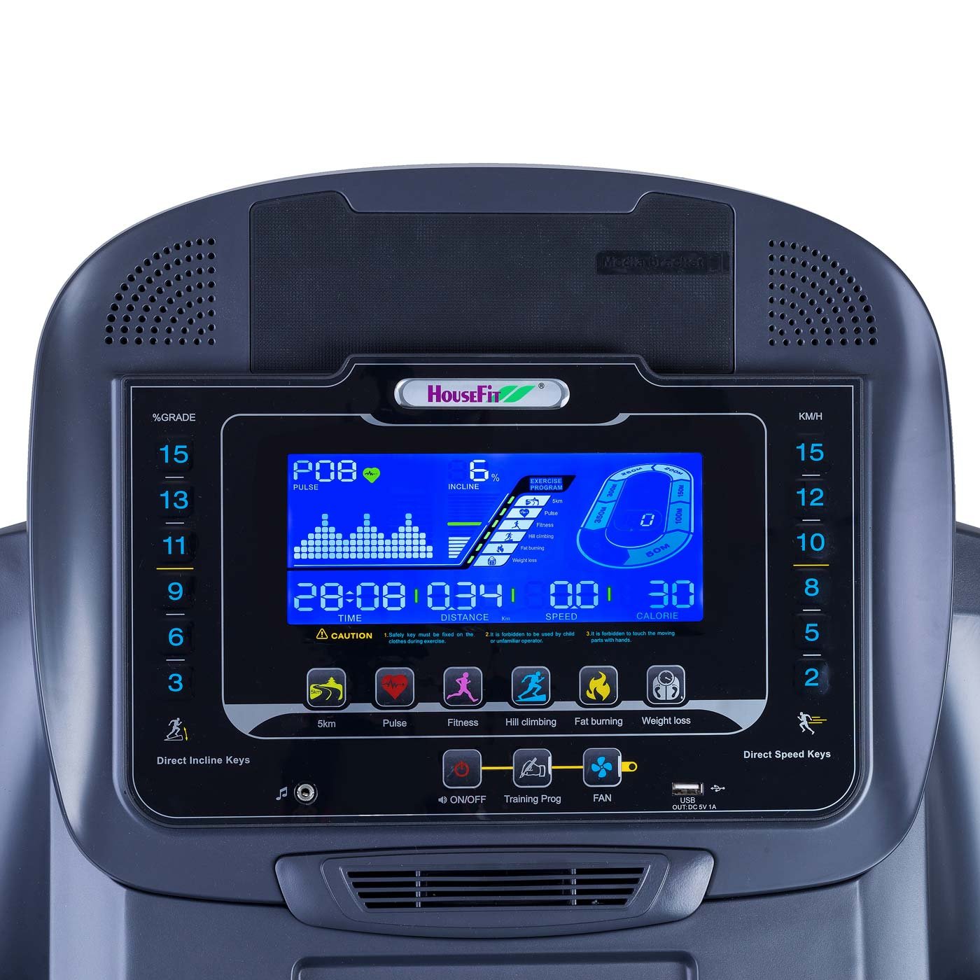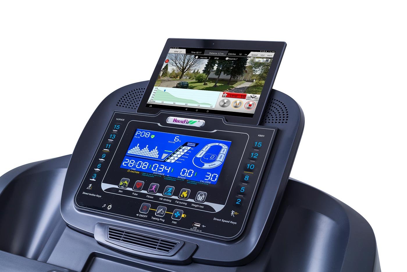 Svůj trénink na běžeckém trenažéru HOUSEFIT SPIRO 80 iRun budete mít pod kontrolou prostřednictvím tréninkového počítače s přehledným barevným podsvětleným 7" LCD displejem s řadou programů. Na displeji vidíme zobrazované hodnoty jako čas, vzdálenost, rychlost běhu, sklon pásu, spotřeba kalorií a měření tepové frekvence. Kompletní nabídka programů obsahuje celkem 15 tréninkových programů mezi nimiž najdeme 12 přednastavených programů (Weight loss, Fat burning, 5 km, Fitness, Hill climbing), 2 HRC programy řízené podle tepové frekvence a 1 uživatelský program s možností vlastního naprogramování, manuální režim a podobně. Jednotlivé programy si můžete upravit libovolně na vyšší nebo nižší intenzitu podle vlastních sil.