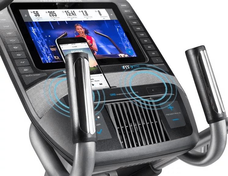 Eliptický trenažér NORDICTRACK Commercial 14.9 má multifunkční podsvícený 10" LCD displej s nastavitelným držákem na tablet, který se snadno ovládá a zobrazuje všechny běžné hodnoty tréninku. Vyobrazené parametry na displeji jsou: čas, rychlost, vzdálenost, spálené kalorie a tepová frekvence (pomocí dlaňových snímačů, či hrudního BLUETOOTH pásu, který není součástí balení). Z programové nabídky má 35 přednastavených programů pro spalování tuku, zvyšování tělesné kondice apod. Stroj disponuje 2 zabudovanými reproduktory s možností připojení MP3 přehrávače nebo smartphonu. Součástí stroje je držák na tablet, který využijete pro tréninkovou aplikaci nebo sledování filmů pro maximální komfort při tréninku. Tablet není součástí dodávky.