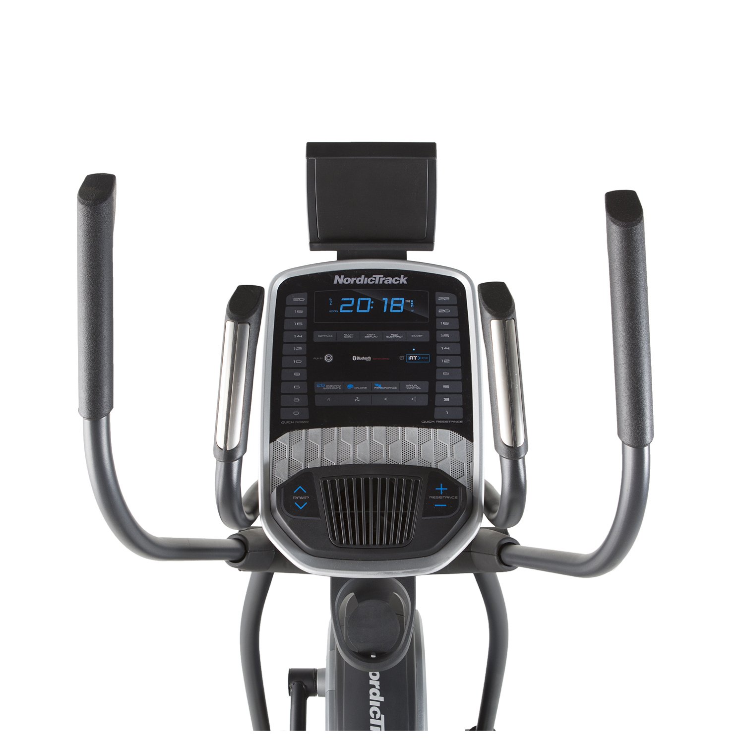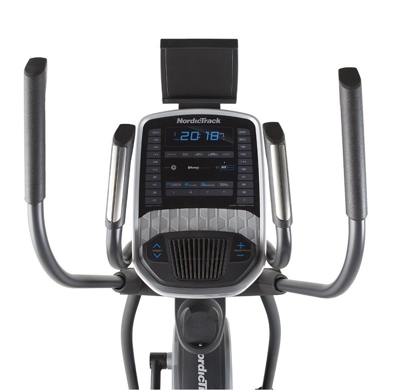 Eliptický trenažér NORDICTRACK C7.5 (new) má multifunkční podsvícený 5" LCD displej s nastavitelným držákem na tablet, který se snadno ovládá a zobrazuje všechny běžné hodnoty tréninku. Vyobrazené parametry na displeji jsou: čas, rychlost, vzdálenost, spálené kalorie a tepová frekvence (pomocí dlaňových snímačů, či hrudního BLUETOOTH pásu, který není součástí balení). Z programové nabídky má 26 přednastavených programů pro spalování tuku, zvyšování tělesné kondice apod. Rukojeti mají integrovaná madla pro měření tepové frekvence a možnost připojení hrudního pásu přes bluetooth. Stroj disponuje 2 zabudovanými reproduktory s možností připojení MP3 přehrávače nebo smartphonu. Součástí stroje je držák na tablet, který využijete pro tréninkovou aplikaci nebo sledování filmů pro maximální komfort při tréninku. Tablet není součástí dodávky.