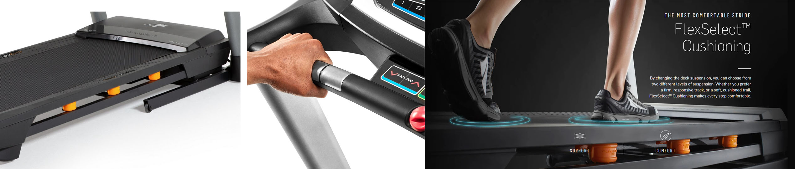 Masivní rám trenažéru, s nosností stroje až 125 kg, zaručuje jeho dlouhou životnost i při pravidelném používání. Běžecká plocha má prostorné rozměry 51 x 152 cm (šířka x délka) a tím pádem univerzální použití pro drobnější i vyšší postavy. Speciální systém odpružení "FlexSelect" zaručují maximální komfort a šetrnost k vašim kloubům.