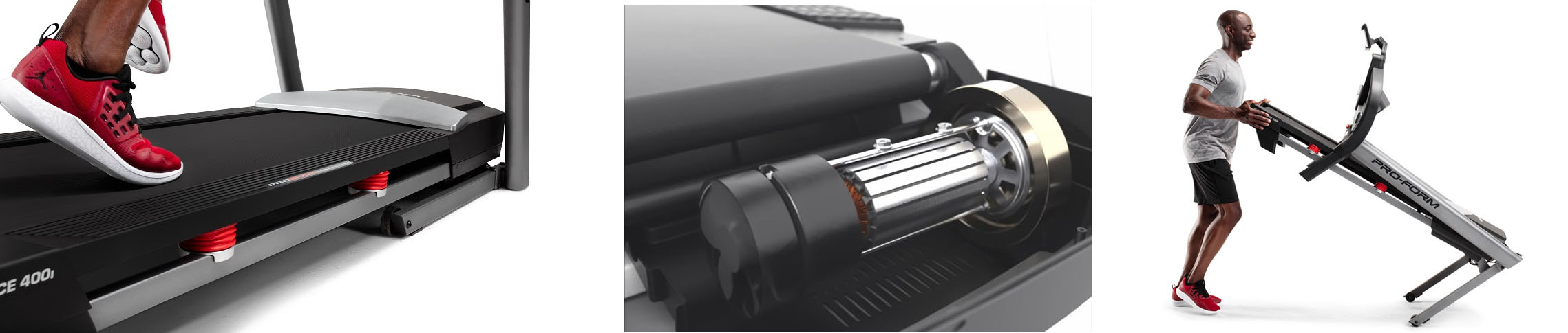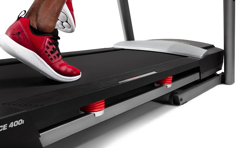 Model PROFORM Performace 400i nabízí prostornou běžeckou plochu o rozměrech 46 x 127 cm s patentovaným odpružením ProShox™ Cushioning. Tyto patentované tlumiče nárazů minimalizují dopad na běžeckou plochu, takže při chůzi, joggingu nebo běhu budou vaše klouby minimálně zatěžované. Při menším namáhání nohou, kotníků, kolen a zad si budete moci užít pravidelný a dloudobý trénink.