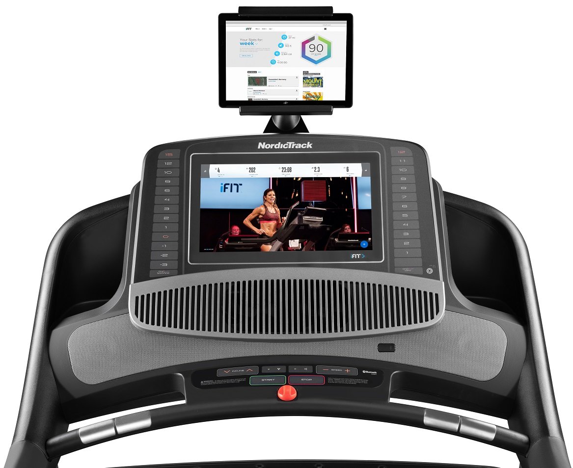 Svůj trénink na běžeckém trenažéru NordicTrack Commercial 2450 budete mít pod kontrolou prostřednictvím tréninkového počítače s přehledným 14" grafickým dotykovým displejem. Na displeji vidíte zobrazované hodnoty jako čas, vzdálenost, rychlost běhu, sklon pásu, spotřeba kalorií, měření tepové frekvence apod. Z programové nabídky máte k dispozici celkem 50 programů. Vybírat můžete z programů zaměřených na spálené kalorie, tepovou frekvenci, sklon nebo rychlost. Tréninková aplikace iFit je zabudovaná přímo v konzoli počítače (tablet tedy nebudete potřebovat). Součástí dodávky stroje je i roční FAMILY licence (až pro 5 osob) na 1 rok zcela ZDARMA! Aplikace vám umožní rozšířit vaše tréninkové plány přes systém Google MAPS. Tablet není součástí dodávky.