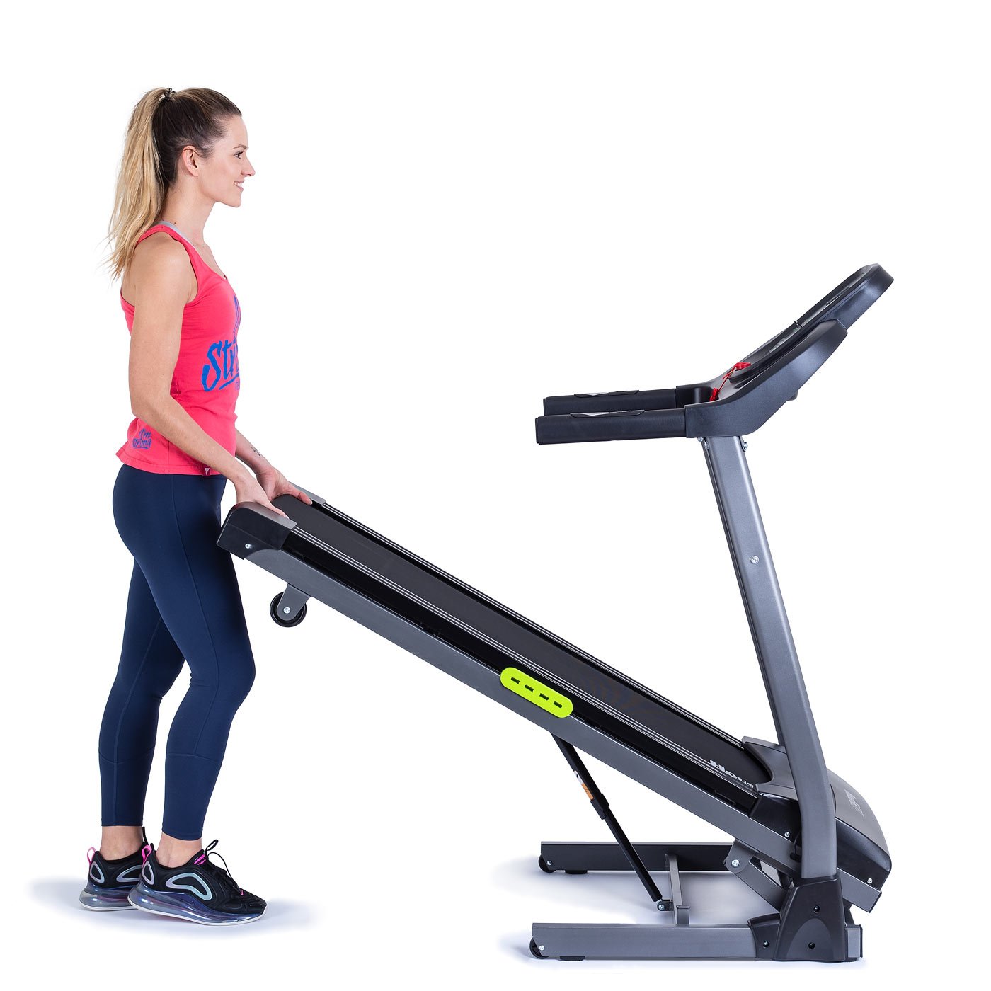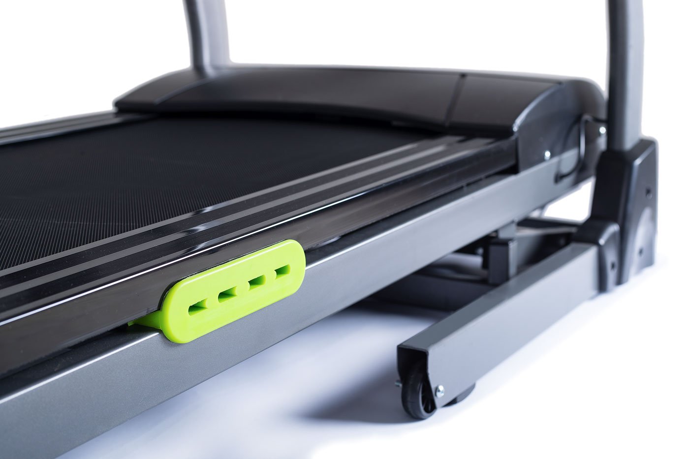 Běžecký pás je možné sklopit do svislé polohy přičemž získáte velmi úsporné rozměry 93 x 70 x 139 cm (délka x šířka x výška). Manipulace při skládání stroje je velice snadná a zvládne ji opravdu každý. Pro jednoduché přemisťování je pás vybaven transportními kolečky. Trenažér disponuje 2 držáky na lahev. Sestavení běžeckého pásu svépomocí vám zabere cca 2,5 hodiny.