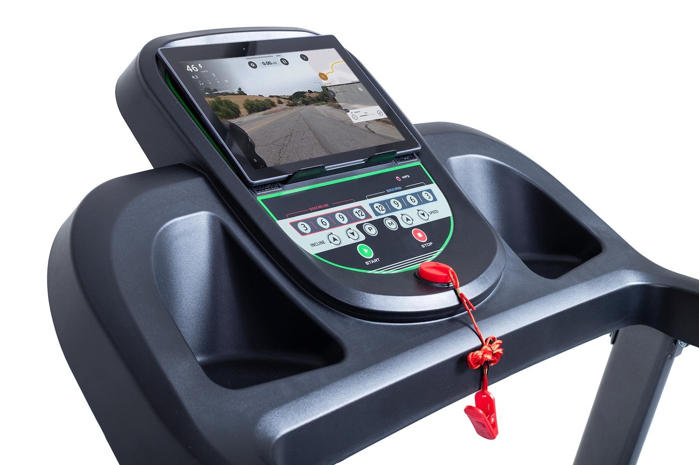 Pomocí tabletu můžete běhat i s tréninkovou aplikaci KINOMAP, která bude prostřednictvím optického senzoru snímat váš pohyb při běhání. Měření tepové frekvence probíhá pomocí senzorů na madlech, tzv. Hand Pulzu, tato hodnota je důležitá pro nastavení spravného tréninku. Na madlech také můžete regulovat i rychlost nebo sklon běžeckého pásu. Zároveň stroj nabízí možnost připojení vašeho telefonu k MP3 připojení pomocí kabelu (klasický 3,5" jack). Pás má zabudovaný reproduktor (kabel pro připojení telefonu k MP3 je součástí dodávky) a vy tak můžete při běhání poslouchat vaši oblíbenou hudbu.