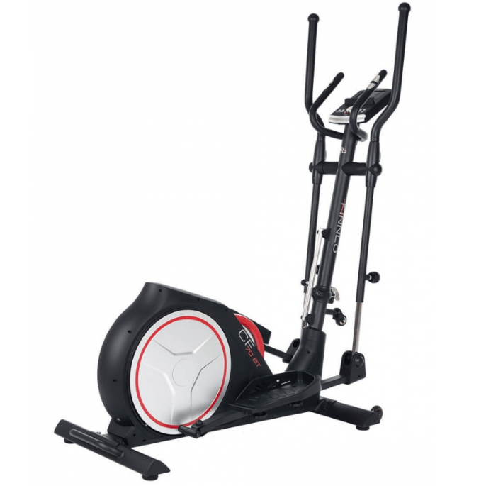 FINNLO CleverFold CF70 BT je moderní eliptický trenažer s robustní konstrukci. Trenažér vám umožňuje trénovat horní i dolní končetiny, aniž tím nijak nezatěžujete klouby a záda. Jeho velkou výhodou je možnost složení, což u eliptikálů nevídáme. Těžký 18 kg setrvačník zajišťuje plynulý a zcela tichý chod i při větší zátěži. Elektronicky ovladatelný odpor je tvořen magnetickým systémem s rozsahem 10 - 350 wattů. Stroj má výbornou ergonomii a mechaniku, kloubní spoje jsou osazeny průmyslovými kuličkovými ložisky. Nosnost trenažéru je až do 130 kg.