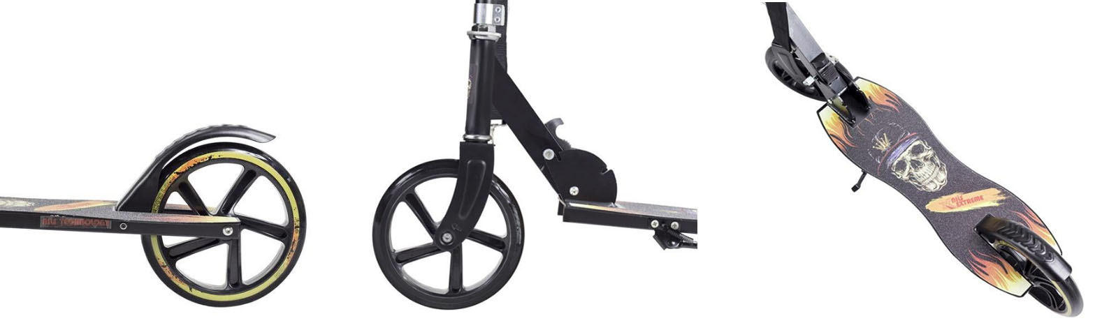 Dalšími výraznými prvky jsou rozšířená protiskluzová nášlapná plocha, madla z pěnového materiálu a zadní brzda. Klademe důraz především na atraktivní vzhled a kvalitní prodevedí, díky kterému máte jistotu, že kupujete kvalitní koloběžky jenž potěší a zároveň i ochrání. Chcete-li pro bezpečnost udělat maximum, nezapomeňte se porozhlédnout po přilbě a chráničích.