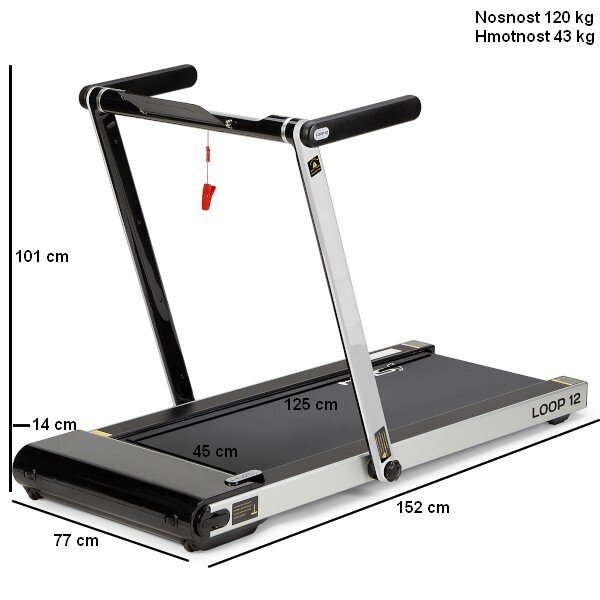 Běžecký pás LOOP12 má nosnost 120 kg. Velikost běžecké plochy je 125 x 45 cm se 6 silikagelovými silentbloky pro její odpružení, což snižuje zatížení kloubního aparátu. Konzole je vybavena reproduktory, díky kterým můžete poslouchat hudbu nebo sledovat televizní pořady na mobilním zařízení.