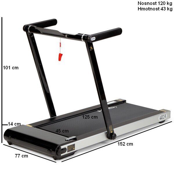 Běžecký pás LOOP12 má nosnost 120 kg. Velikost běžecké plochy je 125 x 45 cm se 6 silikagelovými silentbloky pro její odpružení, což snižuje zatížení kloubního aparátu. Konzole je vybavena reproduktory, díky kterému můžete poslouchat hudbu nebo sledovat televizní pořady na mobilním zařízení.