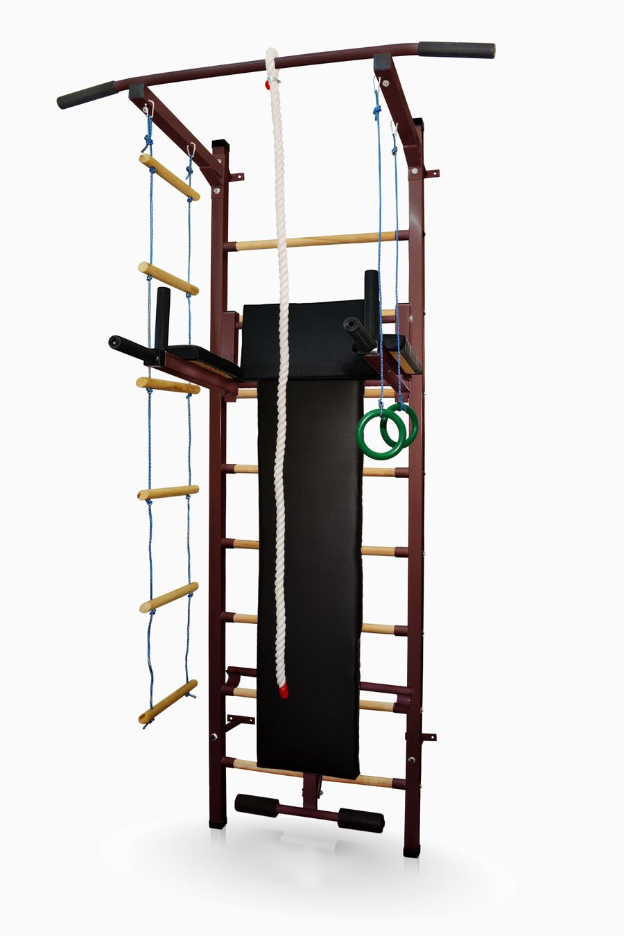 Žebřiny s kovovým rámem a dřevěnými příčkami, v horní části ukončené hrazdou, navíc vybavené provazovým žebříkem, lanem, gymnastickými kruhy, polohovatelnými bradly s opěrkou a posilovací lavicí. Jsou určeny k domácímu tělesnému cvičení. Ribstole jsou univerzálním nástrojem pro zlepšení fyzické kondice a posílení mnoha svalových partií. - 8 dřevených příček o průměru 3,5 cm - horní ocelová hrazda o šířce 115 cm - příslušenství: provazový žebřík, lano, gymnastické kruhy, polohovatelná bradla s opěrkou a odnímatelná skládací lavice - rozměry 66 x 230 cm (šířka x výška) - pevná konstrukce - maximální nosnost 120 kg - kotvení do zdi (montážní vzdálenost od zdi 15 cm)