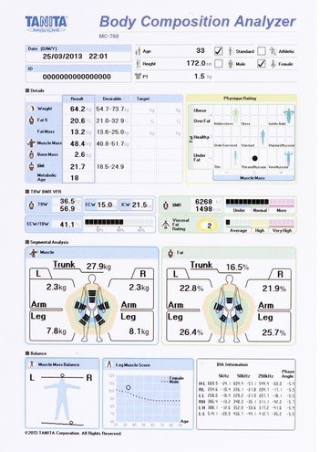 Univerzální multifrekvenční analyzátor segmentového složení těla s interaktivním displejem a vestavěným zařízením pro SD kartu. Metrologicky ověřitelná váha, cejchuschopná. Tanita MC780 multifrekvenční analyzátor segmentového složení těla je ideální pro poskytnutí okamžité analýzy zdraví a fitness stavu klienta a sledování jejich pokroku v průběhu času. MC780 byl navržen jako interaktivní samostatná jednotka, kde se klienti mohou postavit a měřit bez odborné pomoci. Segmentová analýza složení celého těla je provedena za méně než 20 vteřin. Velké duální LED displeje zobrazují naměřená data složení těla a detailní segmentální analýzy ve snadno čitelném ilustrativním formátu . Výsledky měření jsou automaticky ukládány na paměťovou SD kartu, poslány do počítače nebo přeneseny do tiskárny k vygenerování kompletního konzultačního listu pro další vyhodnocení. Data mohou být také zaslány bezdrátově do počítače nebo Windows Tabletu pomocí adaptéru Bluetooth. Cíle pro hmotnost a tělesný tuk lze nastavit pomocí režimu "plánovač cíle" ke zvýšení motivace a zobrazení skutečného pokroku jakéhokoli hubnutí nebo fitness programu. Všechna uživatelská data lze uložit a použít pro podrobnou analýzu pomocí software GMON. MC 780 MA speciální funkce: Multi-frekvenční segmentální analyzátor tělesného složení - 3 frekvence přinášejí velkou přesnost, měření celého těla a segmentů Jednoduché použití - interaktivní konzole vede uživatele přes zadání osobních údajů a měřící proces bez odborné pomoci. Konzole může být otočena pro důvěrné čtení s dětmi nebo pro velmi obézní klienty. Všechny výsledky složení těla jsou uvedeny na snadno čitelném, extra velkém LCD displeji. Duální displej zobrazuje výsledky měření a úplnou segmentální analýzu. Vestavěné zařízení pro SD karty umožňuje ukládání údajů, které jsou automaticky shromažďovány a v pohodlí stahovány - více než 10.000 hodnot může být uloženo na 2GB SD kartu. Identita klientů umožňuje kontinuální měření údajů, které mají být shromažďovány pro každého klienta. Tato funkce také umožňuje shromažďování velkých anonymních dat pro výzkumné studie. Každou tiskárnu s PictBridge lze připojit přímo k MC780, což umožní vytištění konzultačních listů ihned po měření. Kompatibilní se softwarem GMON PRO umožňující úplnou správu databází, zdravotní posudky a zprávy o pokroku, které budou generovány. Modulární 3-dílná konstrukce pro bezproblémovou instalaci, údržbu a dopravu. Schválené normy: Zákon 268/2014 Sb. o zdravotních prostředcích, Nařízení vlády č. 326/2002 Sb. pro váhy s neautomatickou činností, třída III, úředně ověřená. Měření : Tělesný tuk% Hmota tělesného tuku Tučná hmota Netučná hmota Svalová hmota Celková tělesná voda (TBW) Extracelulární voda (ECW) Intracelulární voda (ICW) Poměr ECW / TBW Body mass index Kostní hmota Hodnocení postavy Hodnocení viscerálního tuku Bazální metabolismus kcal Indikátor bazálního metabolismu Metabolický věk Fázový úhel Distribuce tělesného tuku Svalová hmotnostní bilance Skóre svalů dolnícj končetin Segmentální měření procenta tuku pro každou nohu, paže a trup (břišní oblast), tukové hmoty, svalové hmoty, hodnocení svalové hmoty Reactance / odpor Fázový úhel Podrobnosti o produktu 8 elektrod, 3 frekvence pro segmentální analýzu tělesného složení Interaktivní design umožňuje klientům měření bez odborné pomoci Extra velký duální displej konzole se snadno čitelnou grafikou Výstupní data přímo na libovolné tiskárně standardu PictBridge pro generování konzultačního listu Bezdrátový přenos dat pomocí Bluetooth adaptéru Vestavěné zařízení pro SD karty USB připojení Schválené normy Zákon 123/2003 Sb. o zdravotních prostředcích, Nařízení vlády č. 326/2002 Sb. pro váhy s neautomatickou činností, třída III, úředně ověřitelná Maximální nosnost 270 kg Přesnost měření 0,1 kg Technické parametry Nosnost: 270 kg Přesnost vážení: 0,1 kg Přesnost měření tělesného tuku: 0,1 Napájení: AC adaptér 100 až 240 V (50/60Hz) Záruční doba: 3 roky VIDEOUKÁZKA: http://www.youtube.com/watch?v=xIsO4nEdC_8
