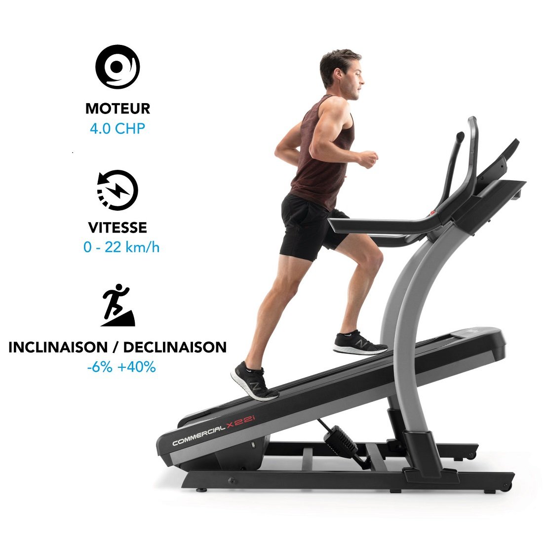 NORDICTRACK Incline Trainer X22i je běžecký trenažér nejen pro domácí fitness, ale i pro lehce komerční provozy. Bude vhodný pro pravidelný trénink začínajících sportovců, pokročilejších běžců, ale i pro vášnivé sportovce. Stroj poskytuje kombinaci kvalitní mechaniky a masivního rámu s nosností až do 135 kg váhy cvičence. Motor s trvalým výkonem 4 HP (2,98 kW), běžecká plocha o velikosti 55 x 152 cm, elektronicky nastavitelná rychlost do max 22 km/h stejně jako elektornicky regulovaný sklon v rozmezí od -6 % + 40 %, nabídne každému maximální komfort při běhání. Rychlost i sklon plochy můžete nastavit krokově nebo už přednastavenými tlačítky na panelu PC. Využijte dnešní mimořádnou slevu 1500 Kč s kódem nordictrack.