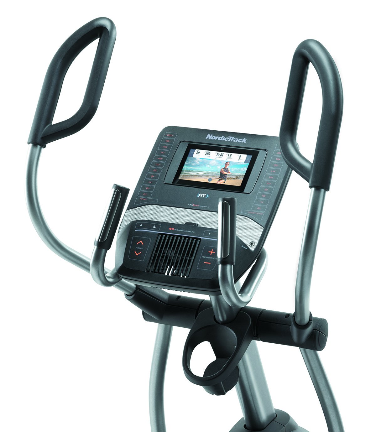 Eliptical NordicTrack Commercial C9.9 nabízí podsvícený 7" grafický dotykový displej, který se snadno ovládá a zobrazuje všechny běžné hodnoty tréninku. Základní zobrazované parametry na displeji jsou: čas, rychlost, vzdálenost, spálené kalorie (spotřeba Kcal), zátěž a tepová frekvence (pomocí dlaňových snímačů, či hrudního BLUETOOTH pásu, který není součástí balení, můžete ho ale u nás dokoupit). Z programové nabídky má 26 přednastavených programů pro spalování kalorií a zvyšování tělesné kondice. Stroj disponuje zabudovanými reproduktory s možností připojení MP3 přehrávače. Součástí stroje je držák na tablet, který využijete pro tréninkovou aplikaci iFit nebo sledování oblíbených seriálů pro maximální komfort při tréninku. Tablet není součástí dodávky.