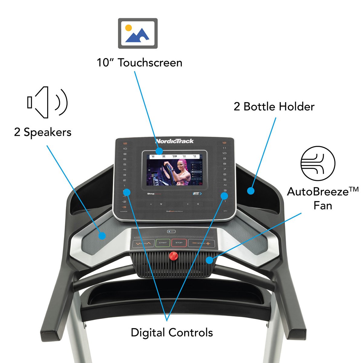 Model běžeckého pásu NORDICTRACK EXP 10i disponuje ventilátorem, díky kterému bude trénink komfortnější, reproduktory pro poslech hudby nebo mluveného slova a držáky na lahev s pitím. Veškeré ovládání je umístěno na konzoli běžeckého trenažéru. Ke snadnějšímu přemísťování pomůžou transportní kolečka, která jsou součástí stroje. Pro snadné uskladnění lze pás sklopit do vertikální polohy, která šetří místo, pokud zrovna necvičíte. Se systémem SpaceSaver® pás jednoduše složí i drobnější postava. Složení i rozložení je bezpečné díky pomocnému tlumiči a bezpečnostní pojistky, která zabraňuje nechtěnému vyklopení pásu.