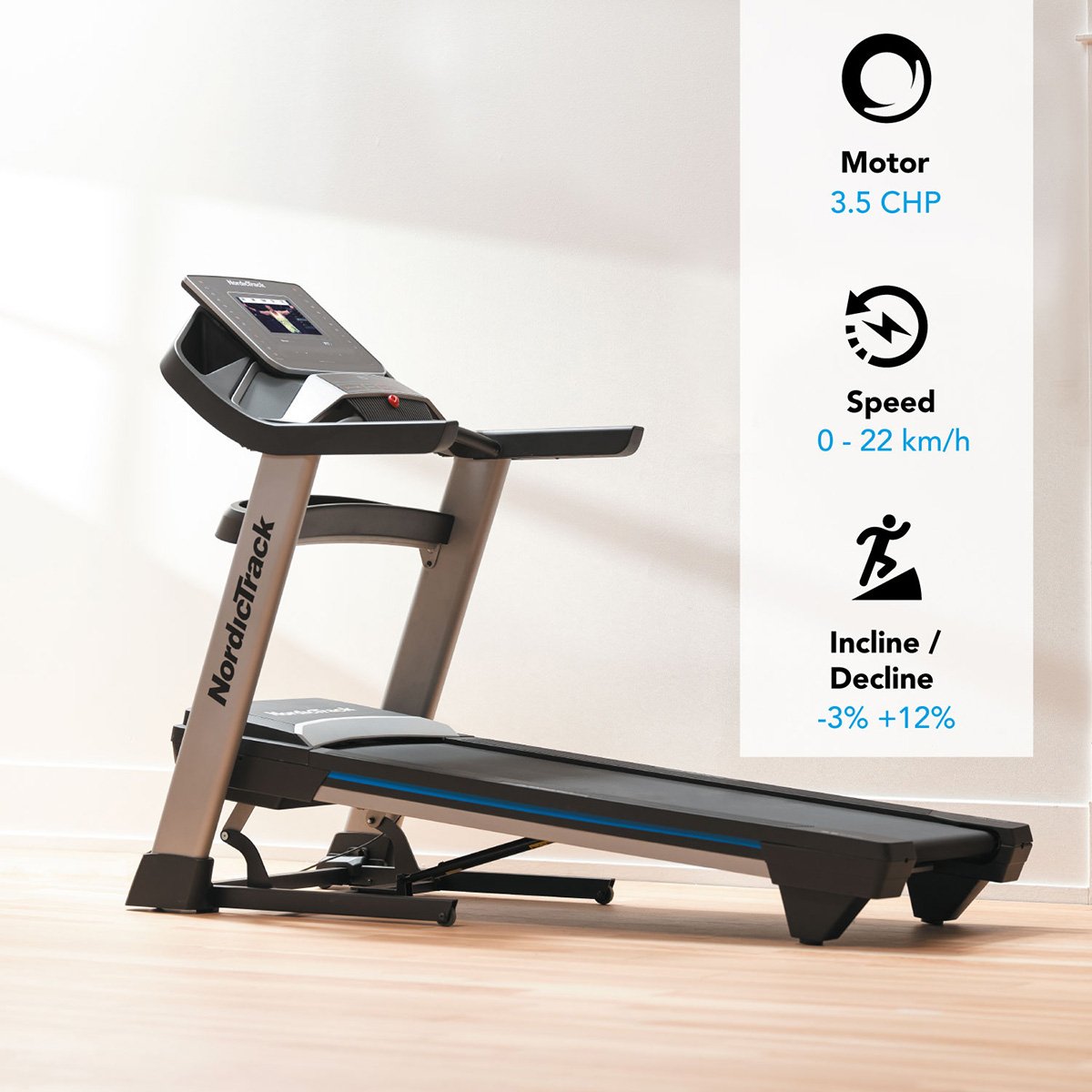 ID: NTL15421-INTDomácí využití, nosnost 136 kg, aplikace iFIT, 10" displej, ventilátor, reproduktory, max rychlost 22 km/hod, sklon - 3 % + 12 %, transportní kolečka, možnost složení.