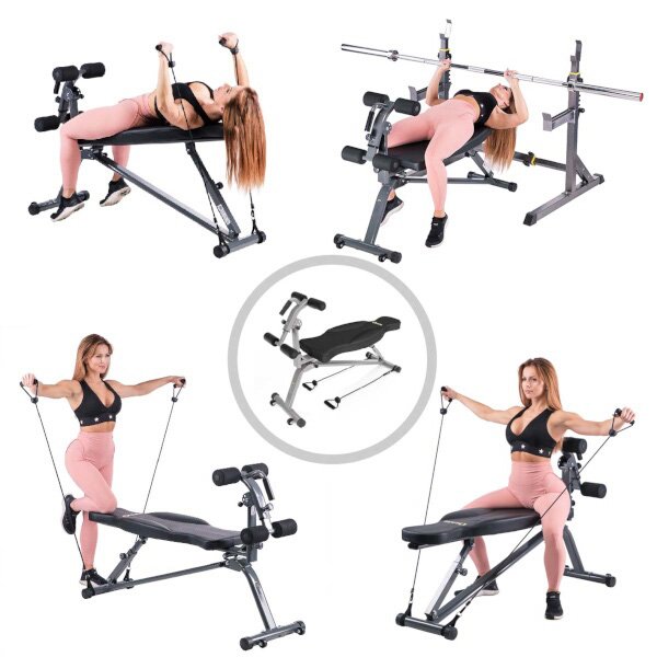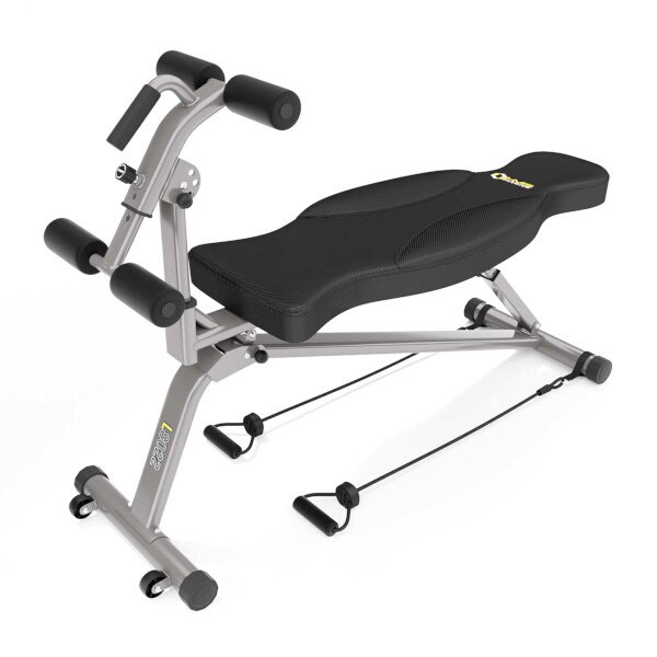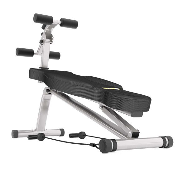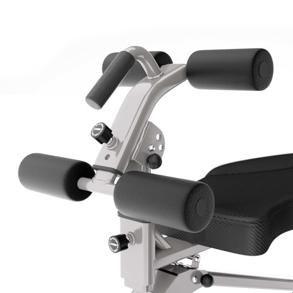 Zádová opěrka je vyvedena z hrubé desky opatřené vysokou vrstvou pěny pro maximální pohodlí během tréninku. Ergonomické polstrování je vyrobeno z umělé kůže s karbonovým vzhledem, je odolné vůči potu a také zamezuje "klouzání" během tréninku. Pěnové válce jsou vyrobeny z EVA pro velký komfort a dlouhou životnost.