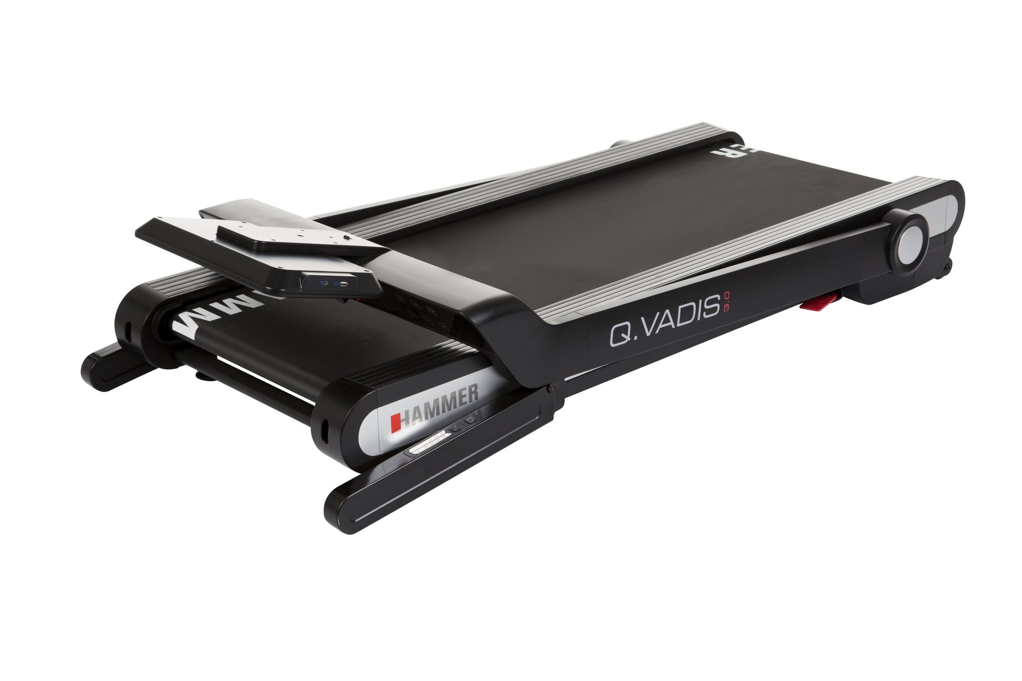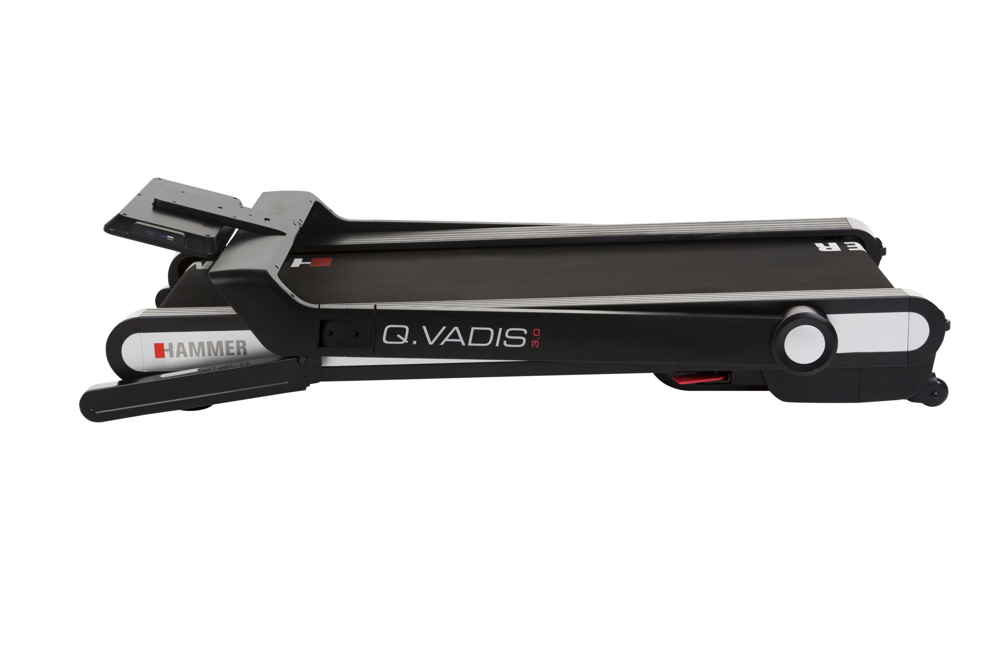 Běžecký pás HAMMER Q. VADIS 3.0 si vás získá svými promyšlenými a výkonnými běžeckými funkcemi! Superrychlé skládání s chytrou a důmyslnou konstrukcí. V rozloženém stavu a v plném provozu si můžete užívat rychlosti až 18 km/h a plného výkonu běžeckého motoru o výkonu 2 hp. Součástí běžeckého pásu je také integrovaný držák na láhev s vodou. Můžete se také virtuálně motivovat pomocí inovativní fitness aplikace Kinomap. Běžecký pás HAMMER Q. VADIS 3.0 běžecký pás zaujme také svým elegantním designem, velkým, snadno čitelným LED displejem a je již 100% předmontovaný! Po skončení tréninku si můžete rychle najít vhodný úložný prostor ve vaší domácnosti. Díky inovativnímu přídavnému tlačítku "Fold Button" na konzole a nožním pedálu můžete běžecký pás zaparkovat ve vertikální nebo horizontální poloze, aniž byste museli použít šrouby. Ať už pod postelí nebo v rohu vedle skříně. Váš Q. VADIS 3.0 můžete uložit a ušetřit tak místo.