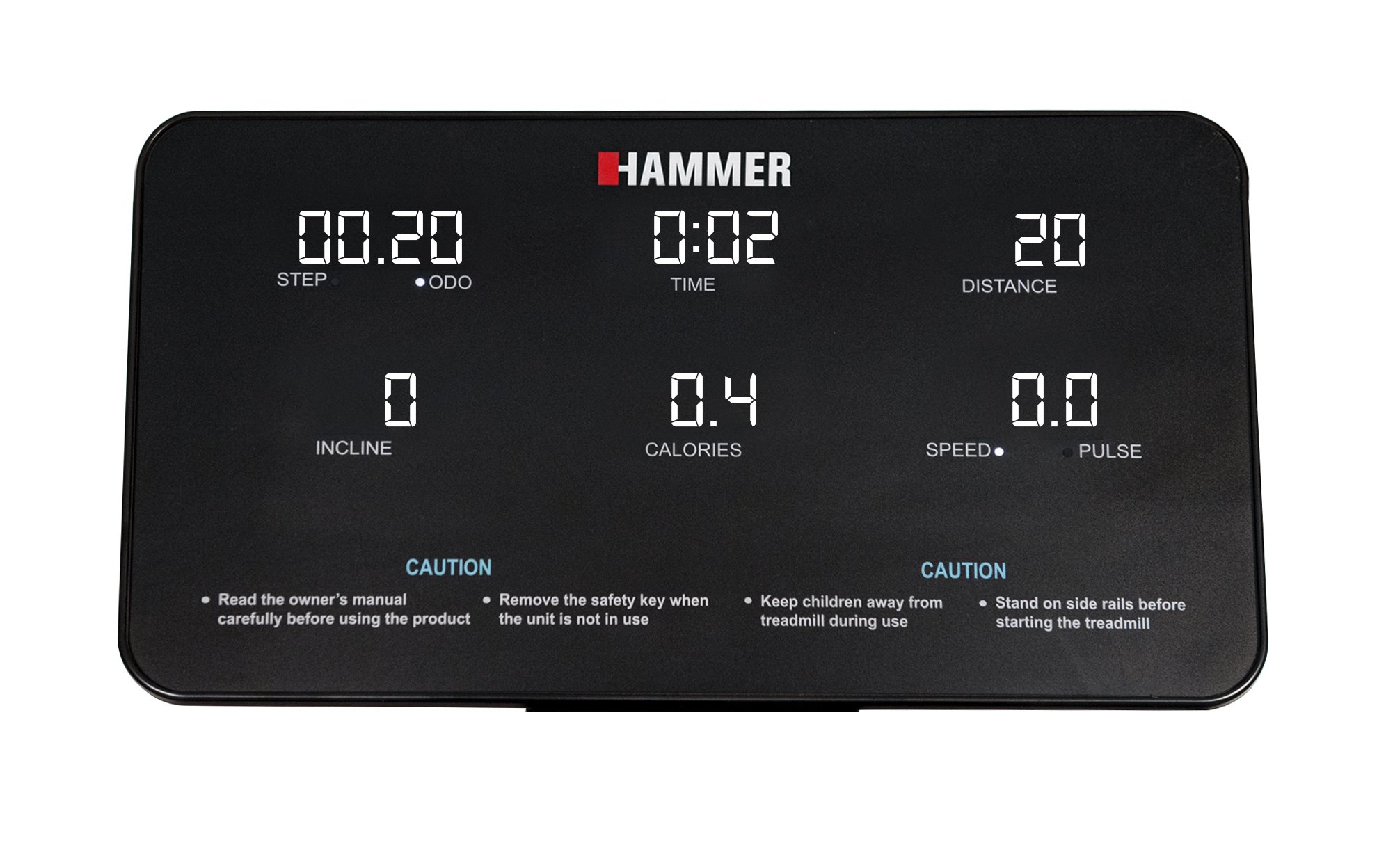 Vaše tréninková data jsou přehledně zobrazena na velkém, snadno čitelném displeji. Na první pohled vidíte následující hodnoty: Vzdálenost, sklon, kroky, kalorie, srdeční tep, čas a rychlost.