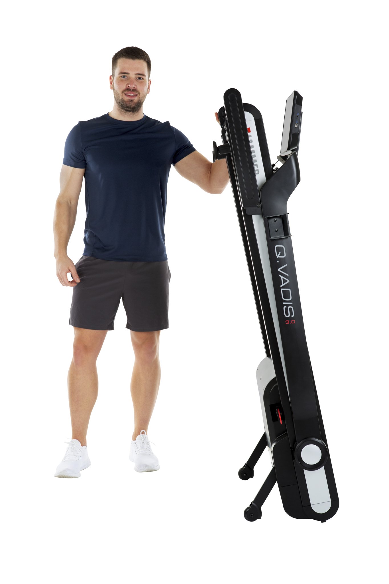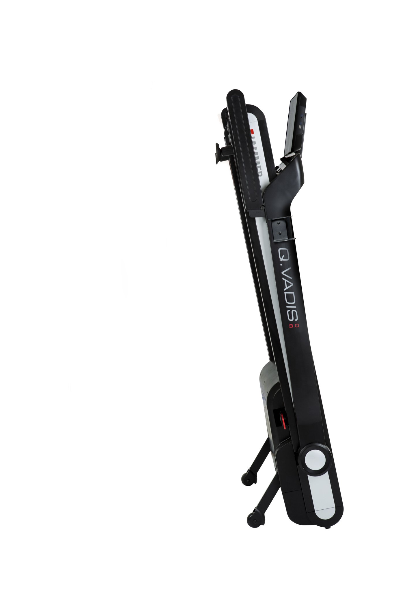 Máte malý byt a jen málo místa pro běžecký pás? V tom případě je tu pro vás trenažér Q. VADIS 3.0 nabízí inovativní a jedinečnou funkci skládání. Skládací mechanismus umožňuje pohodlně a zcela složit běžecký pás jak ve vodorovné, tak ve svislé poloze.