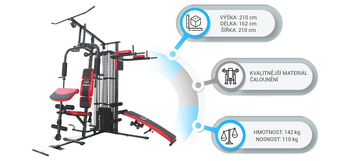 Atlas Tytan 12 HMS je profesionální multifunkční nástroj pro domácí cvičení. Díky krytému zásobníku zátěží je velice bezpečný, navíc má ze tří částí profilovanou opěru zad pro správné držení těla. Atlas umožňuje bezpečné cvičení různých svalových skupin jako například v profesionální tělocvičně. Je ideální pro ženy i muže, kteří si chtějí zlepšit kondici, zlepšit vzhled postavy, zvýšit a posílit svalovou hmotu. Atlas umožňuje rozvoj všech svalových skupin: bříšních svalů, prsních svalů, lichoběžníkové, posturální, předloktí, ramena, triceps a také umožňuje trénovat nohy. Novinkou je kvalitnější materiál čalounění!