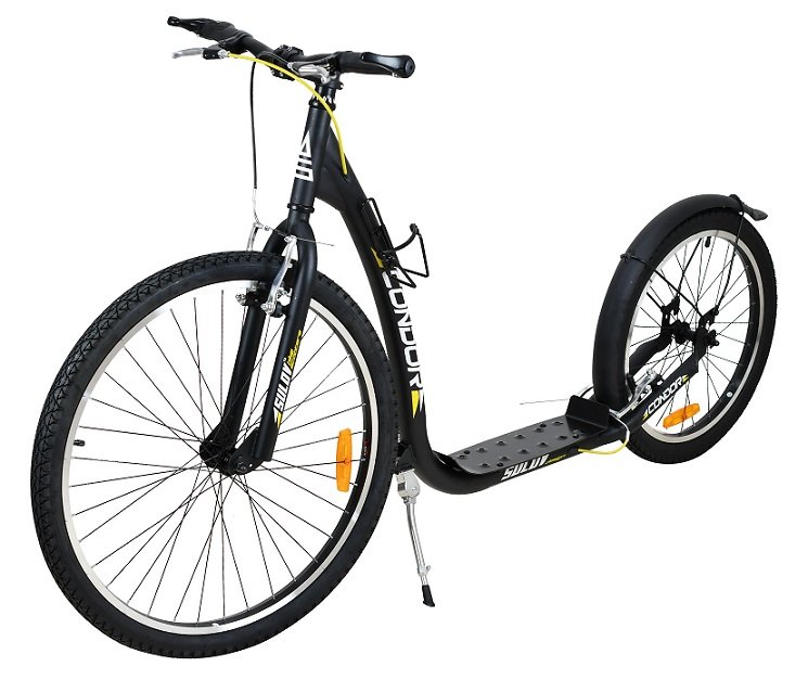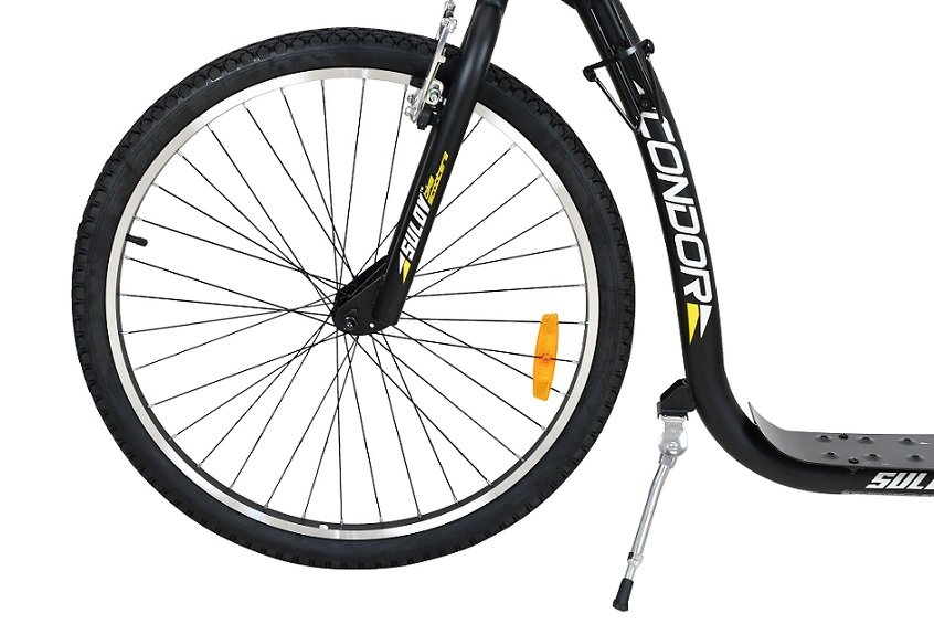 Sportovní koloběžka Sulov CONDOR je díky velkým nafukovacím kolům 26"/20" ideální pro jízdu ve městě i na zpevněných cyklostezkách. Rám koloběžky z kvalitní odlehčené oceli. Ve výpletech kol jsou odrazky pro zvýšení bezpečnosti. Přední a zadní hliníkové V-brzdy, hliníkové ráfky. Součástí vybavení je držák na lahev, sklopný stojánek, zadní ocelový blatník a rohy na řidítkách.