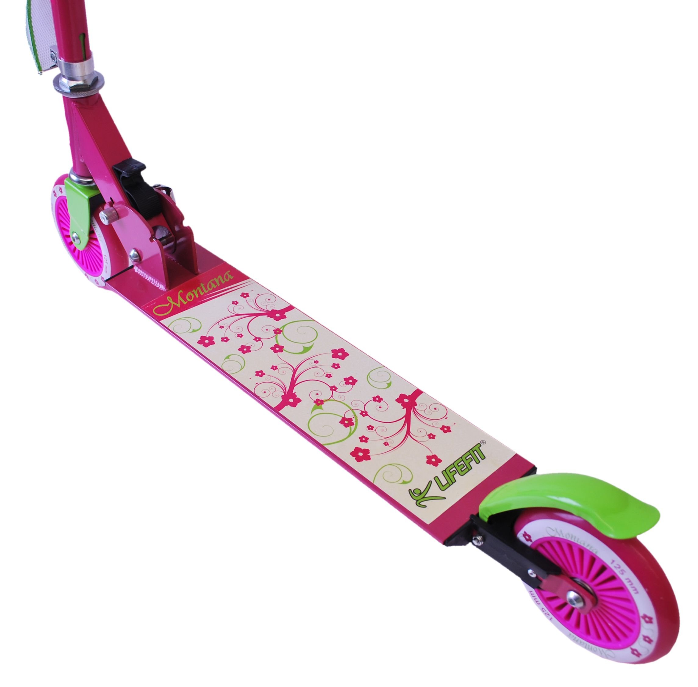 Koloběžku LIFEFIT MONTANA si díky krásnému designu oblíbí zejména mladé slečny. Koloběžka LIFEFIT MONTANA splňuje nejvyšší standard provedení a bezpečnosti, důkazem toho je vlastnictví certifikátu nejpřísnějších evropských norem EN-71. Koloběžka LIFEFIT MONTANA se dá díky propracovanému mechanizmu snadno a rychle složit i rozložit. Protiskluzový nášlap a zadní blatníková brzda zabezpečují vysokou bezpečnost. Kolečka 125mm jsou osazena skvělými ložisky ABEC 5, čímž zaručují výborné jízdní vlastnosti. - atraktivní skládací koloběžka LIFEFIT MONTANA