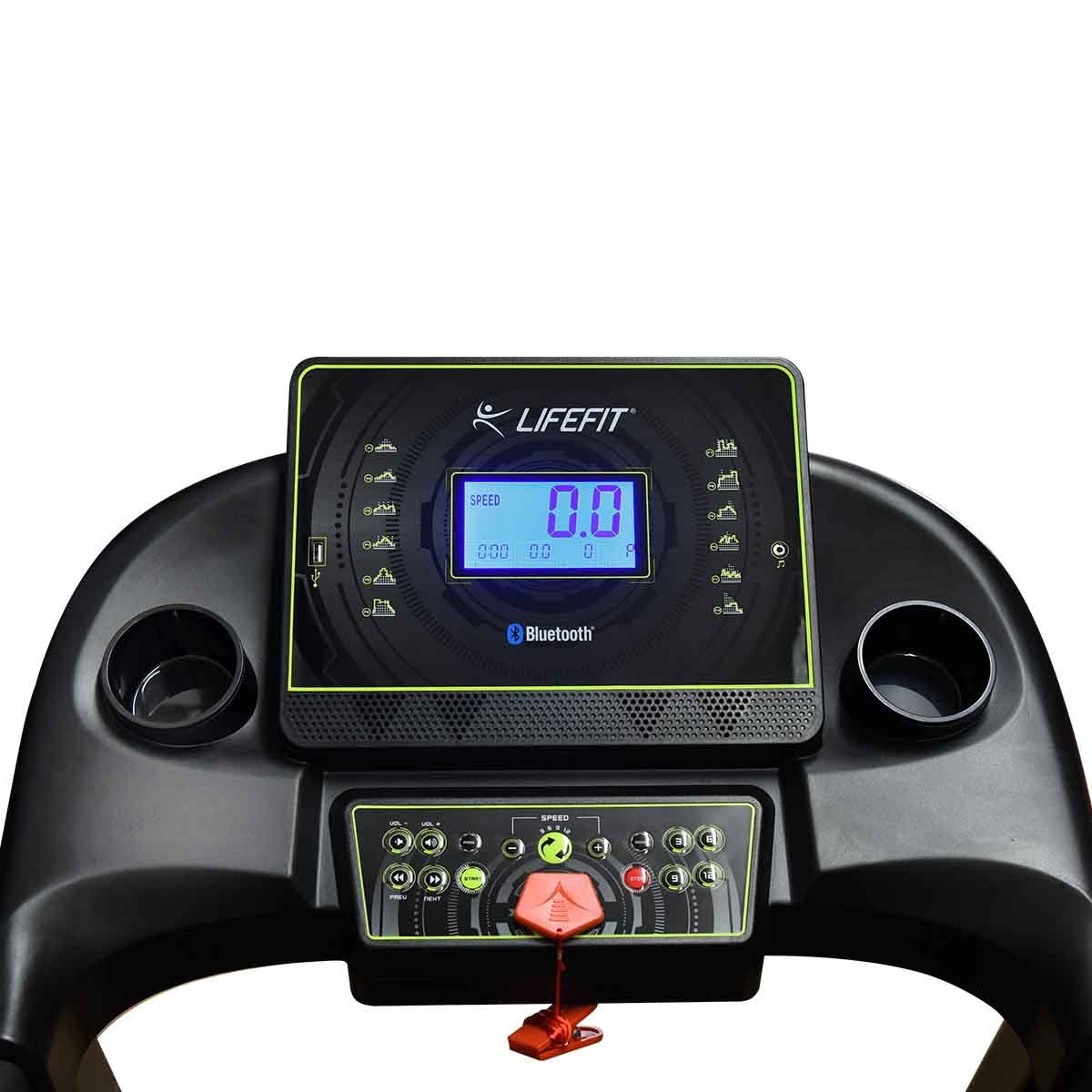 Svůj pravidelný trénink budete mít zcela pod kontrolou pomocí přehledného 5“ LCD displeje, který vám přehledně zobrazí čas i rychlost vašeho běhu, zdolanou vzdálenost, spotřebu kalorií i okamžitou naměřenou tepovou frekvenci, která je snímána pomocí tzv. „hand pulsů“ situovaných přímo v madlech trenažéru. Na madlech též najdete tlačítka pro regulaci rychlosti a START/STOP. Bluetooth propojení poskytne možnost využití fitness aplikace FITShow nebo měření tepové frekvence s hrudním pásem, který srdeční činnost naměří s přesností EKG. Bezpečnostní brzda vás ochrání před nenadálým zaškobrtnutím.
