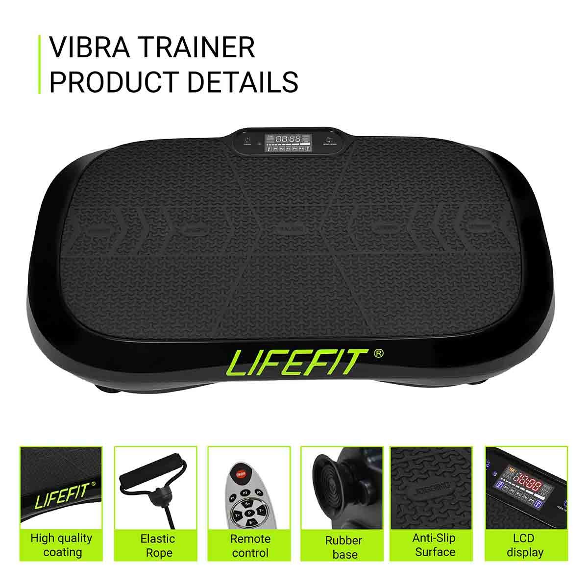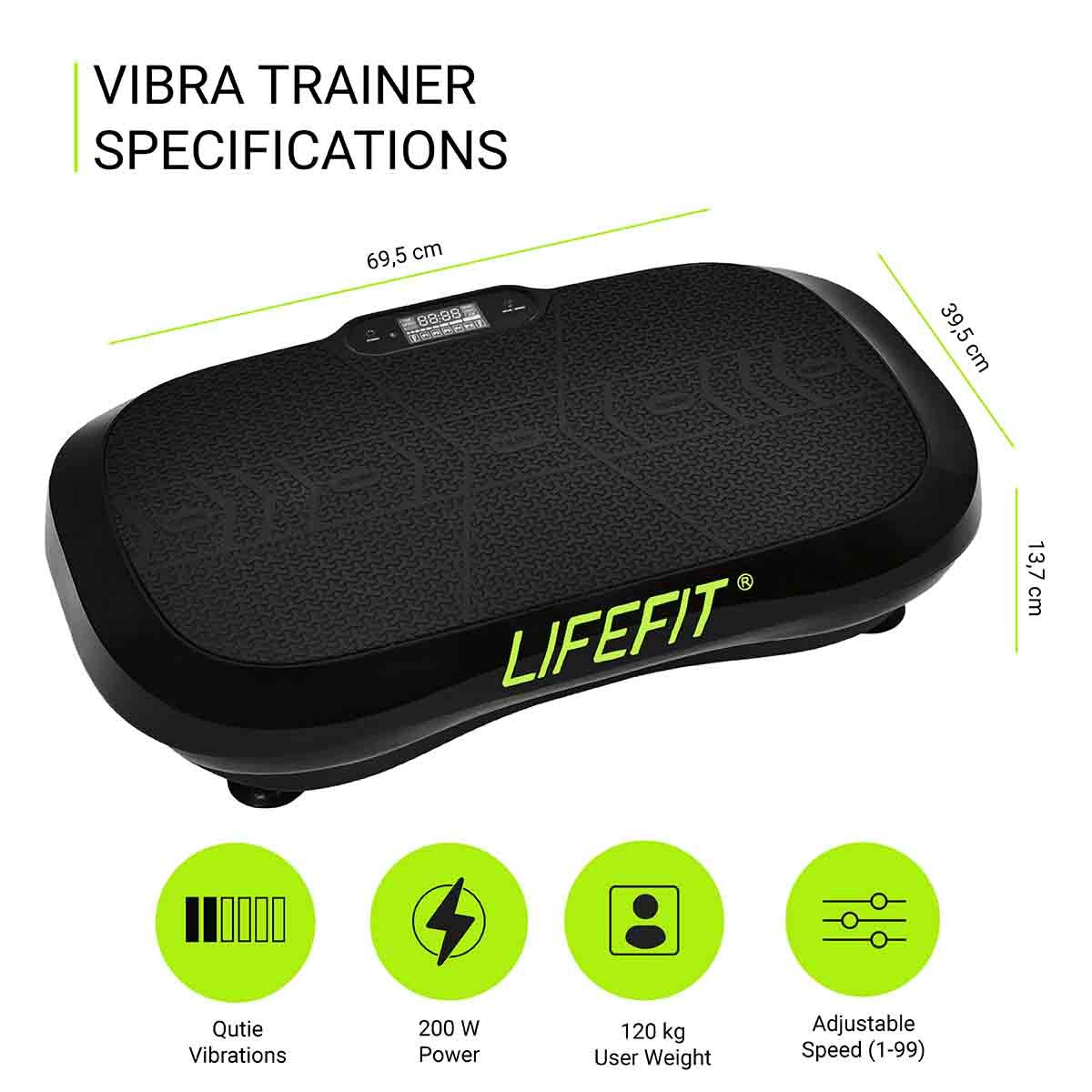 Vibrační plošina LIFEFIT VIBRA TRAINER s přehledným displejem, dálkovým ovladačem a maximální nosností 120kg je praktickou relaxační pomůckou pro efektivní uvolňovací a mírně posilovací cvičení. Masážní deska třídy H, s kompletními rozměry 69,5 x 39,5 cm a hmotností 14kg, je určena především pro domácí a volnočasové využití. Stroj není určen pro terapeutické ani rehabilitační používání.