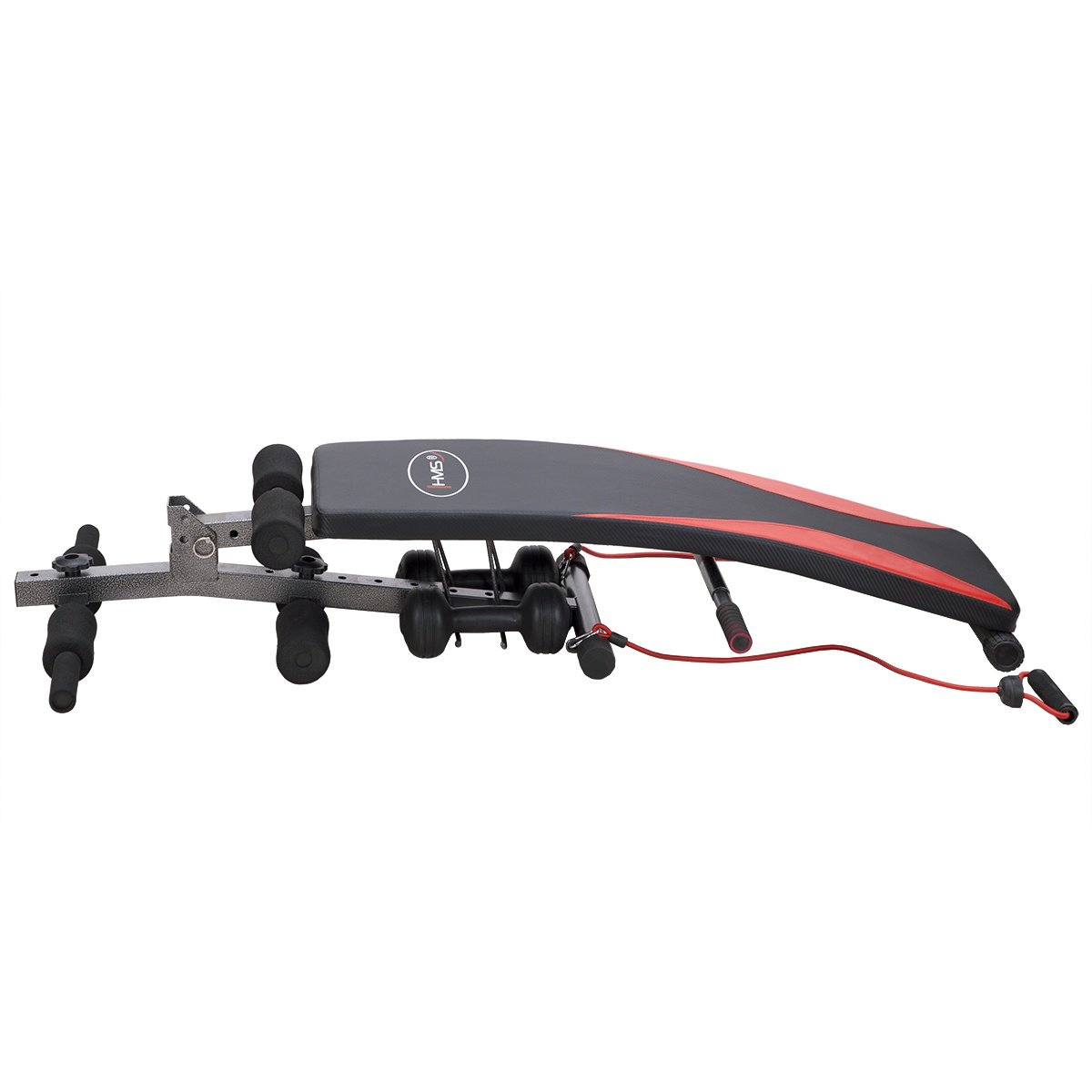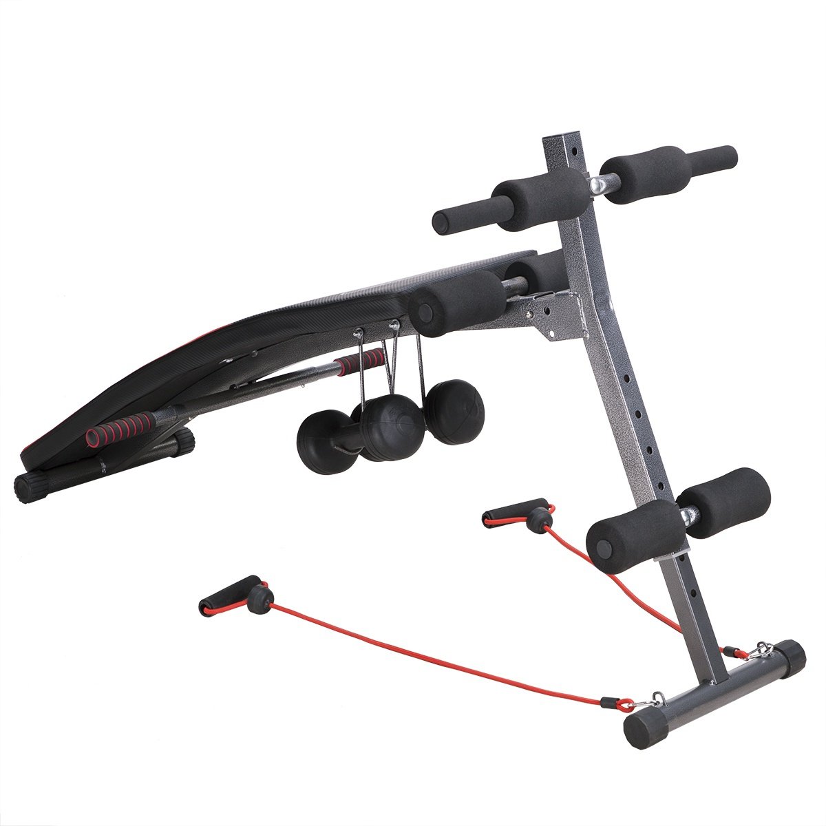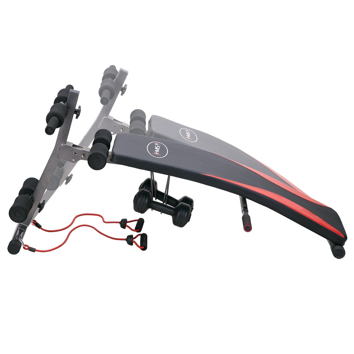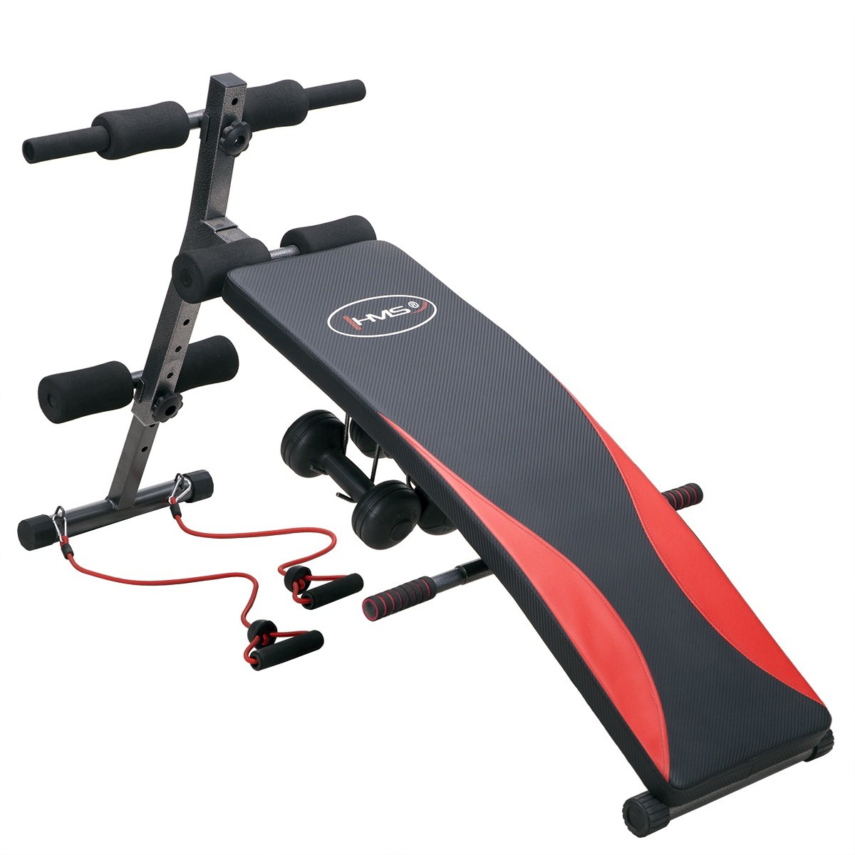 ID: AB-17-3-086Šikmá lavice, protiskluzové úchyty, gumová lanka + 2 x 1,5kg vinylové činky na cvičení rukou, možnost složení, nosnost 100 kg.