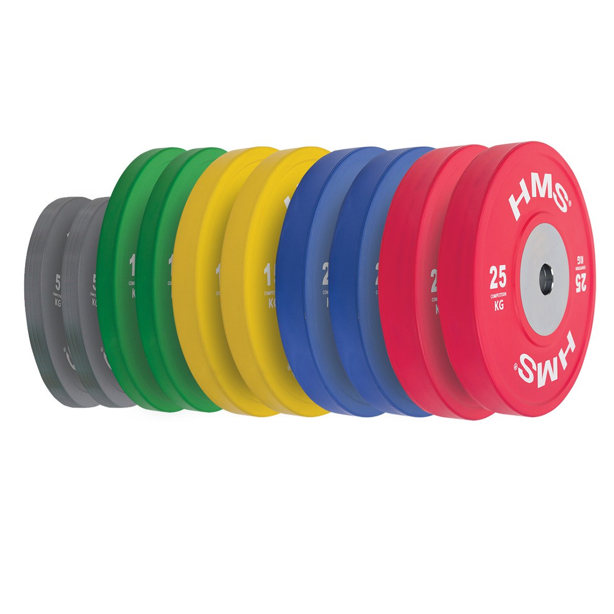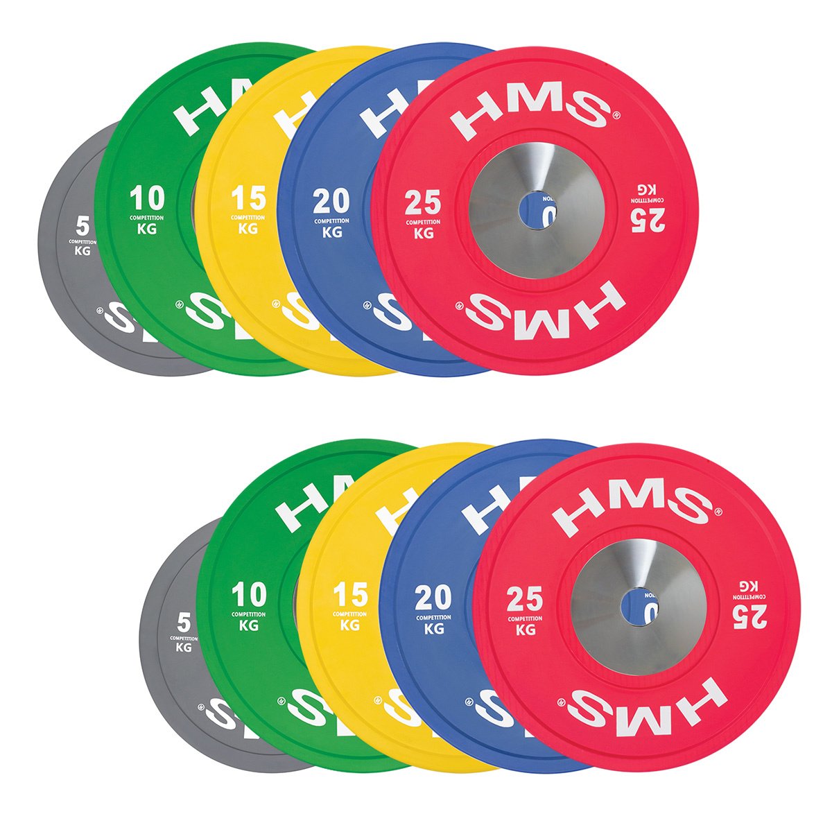 Set oympijských kotoučů HMS vhodný pro závody ve vzpěračství a při funkčním tréninku. Tento set je zbarven přesně podle závodních norem. Jeho hlavním parametrem je odolnost, kdy i po odhodu z velké výšky, zůstane kotouč i podloží bez známky poškození. Kotouč je určen pro olympijské osy s průměrem trnů 50 mm.