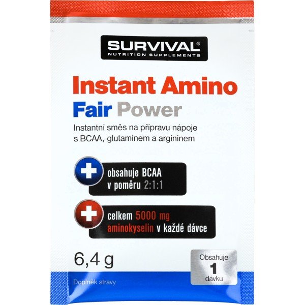 Instant Amino Fair Power jsou fermentací vyrobené volné BCAA aminokyseliny L-leucin, L-isoleucin a L-valin v poměru zastoupení 2 : 1 : 1, doplněné o další 2 díly čistého L-glutaminu a 1 díl L-argininu alfaketoglutarátu - to vše v moderní, snadno rozpustné instantní formě. Každá dávka (6,4 g) obsahuje plných 5000 mg aminokyselin (4800 mg u příchutě cuba libre), prakticky žádné tuky ani cukry. Aminokyseliny Instant Amino Fair Power se velmi snadno rozpouštějí a výborně chutnají. Jsou vhodné pro použití jak v průběhu dne, tak i před nebo po tréninku, ale i v průběhu cvičení. Obsažené aminokyseliny se prakticky okamžitě vstřebávají do krve a i díky obsahu L-argininu se s maximální účinností transportují do svalů. Instant Amino Fair Power využívají stejně jako ostatní produkty značky Survival jen špičkových surovin, neobsahují umělá barviva a mají přehledné, nic neskrývající složení (ověřené laboratorními rozbory - viz galerie fotografií produktu).
