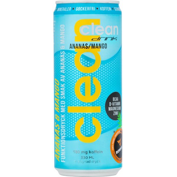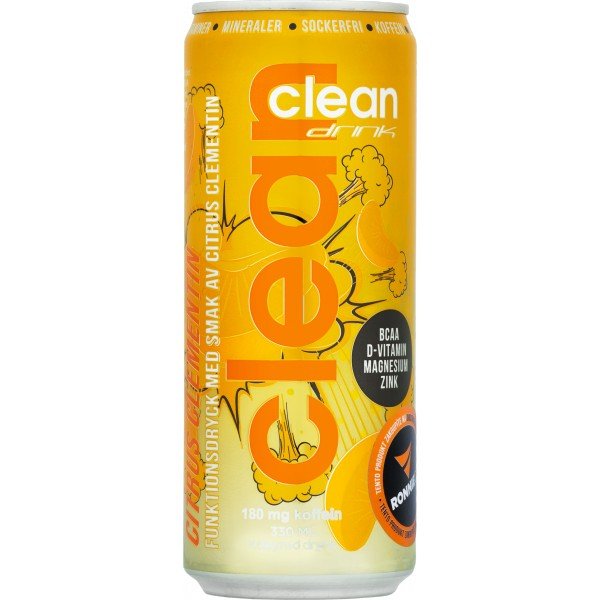 Sycený nápoj s kofeinem a BCAA, vitamínem D, hořčíkem a zinkem. Vhodný pro sportovce a osoby při sportovním a tělesném výkonu. Clean Drink je funkční nápoj vyráběný v severských zemích, bez zbytečných přísad (neobsahuje konzervační látky, taurin, cukr a barviva), obsahuje BCAA, které přispějí k regeneraci a ochraně svalové hmoty, kofein, L-glutamin, 9 - 10 vitamínů, hořčík, chrom a zinek. Je zcela bez cukru. Čistý nápoj bez aspartamu a bez kalorií.