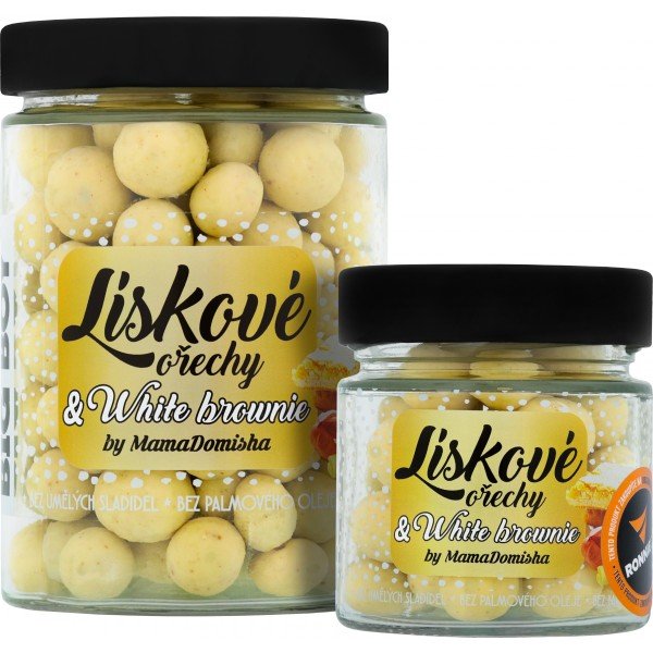 Na sucho pražené lískové oříšky, které jsme pro Vás obalili v bílé výběrové čokoládě s příchutí white brownie. První, co ucítíte, bude křupnutí lískového oříšku a poté se Vám na jazyku rozplyne chuť nejoblíbenějsí bílé čokolády. Pozor, silně návykové!