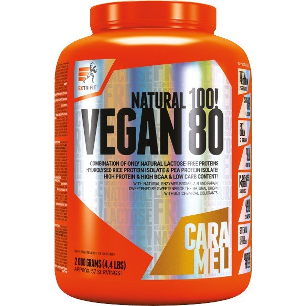 Proteinový izolát z výhradně rostlinných zdrojů. Neobsahuje laktózu. Vynikající alternativa k syrovátkovým a mléčným proteinům. Tento špičkový rostlinný izolát má dokonalé parametry. Na rozdíl od jiných rostlinných proteinů, se kterými jste se setkali, má Extrifit Vegan 80 obsah bílkovin až 75 % a obsah BCAA až téměř 5000 mg v jediné odměrce! Jedná se tedy o naprosto rovnocenný zdroj proteinů s aminospektrem prakticky shodným se syrovátkovými proteiny. Vegan 80 je tedy velmi vhodný pro budování a růst svalové hmoty a díky téměř nulovému obsahu cukrů i do diety.