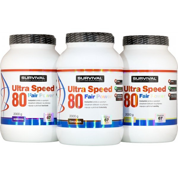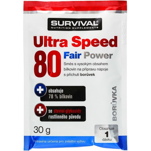Ultra Speed 80 Fair Power je svým složením i vlastnostmi jedním z nejlepších dostupných proteinových suplementů v České republice. Je určen pro všechny sportovce, kteří usilují o nárůst svalové hmoty, ale i lepší regeneraci či sportovní výkony, často je používán i jako náhrada jídla v redukčních dietách. Je skvělý po tréninku, ráno po probuzení i přes den. Ultra Speed je složený ze tří nejkvalitnějších zdrojů bílkovin, obsahuje plně instantní (= snadno rozpustný) syrovátkový nativní CFM mikrofiltrovaný proteinový koncentrát, dále pak instantní syrovátkový nativní CFM mikrofiltrovaný proteinový izolát a také syrovátkový enzymaticky štěpený hydrolyzovaný proteinový koncentrát s nejvyšším možným stupněm hydrolýzy DH32. Neobsahuje lepek.