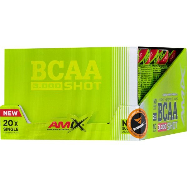 BCAA 3000 Shot je doplněk stravy v tekuté formě v kapesním balení ampulí s vysokým obsahem esenciálních aminokyselin s rozvětveným řetězcem BCAA v poměru 2:1:1 - L-leucin, L-isoleucin, L-valin. Bez přidaného cukru a barviv. BCAA jsou esenciální aminokyseliny, které naše tělo není schopno syntetizovat, proto musejí být dodávány zvenku ve formě potravy nebo doplňků stravy. Jsou potřebné pro udržení svalové tkáně během intenzivního cvičení, jsou součástí bílkovin, které podporují růst svalové hmoty. Díky jednotlivým ampulím si jej můžete snadno vzít kamkoli!