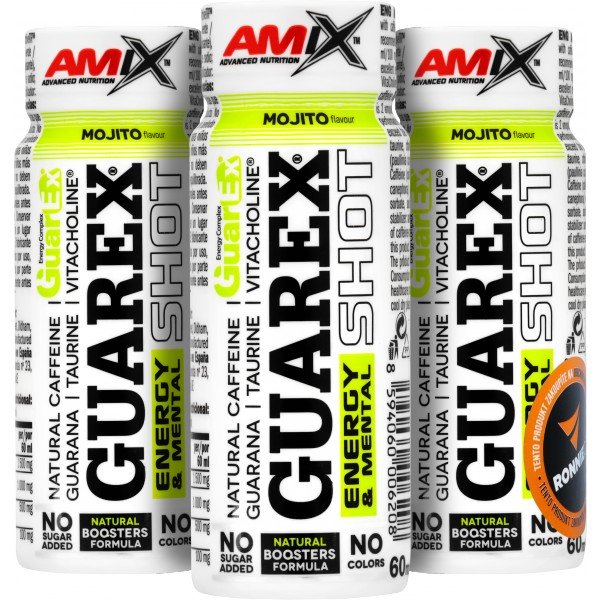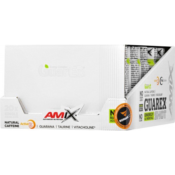 Guarex® Energy & Mental Shot je doplněk stravy v tekuté formě v kapesním balení ampulí. Excelentní dávka energie založená na vysokém obsahu extraktu z guarany, VitaCholine® (cholin bitartrát), taurinu a suroviny ActiveTR™, neboli přírodním enkapsulovaném kofeinu. Díky jednotlivým ampulím si jej můžete snadno vzít kamkoli!