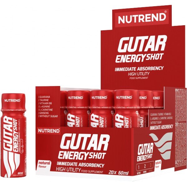 Gutar Energy Shot je skutečně energetický náboj, který obsahuje funkční látky podporující koncentraci. Mezi tyto látky řadíme extrakty z guarany, ze zeleného čaje nebo z ženšenu. Dalšími účinnými látkami jsou oblíbený L-karnitin, aminokyselina L-arginin a také taurin. Obohaceno o vitamín B6, který přispívá ke snížení míry únavy a vyčerpání a k normálnímu energetickému metabolismu.