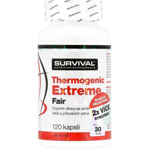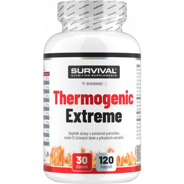 Thermogenic Extreme je v současnosti ([letos]) nejsilnějším komplexním doplňkem sportovní výživy pro všechny sportovce usilující o podporu spalování podkožních tuků. Obsahuje unikátní kombinaci 12 účinných a vědeckými výzkumy ověřených látek (kompletní popis včetně odkazů na studie najdete níže). Tento produkt společnosti Survival je silnější a ještě účinnější verzí oblíbeného Thermogenic Active, kterého se jen v České republice prodalo přes 60.000 kusů. Porovnáte-li složení Thermogenic Extreme s jakýmkoliv (!) doplňkem stravy pro podporu spalování tuků, sami si ověříte, že nový „Extreme“ je tím nejlepším suplementem, jaký současný trh se sportovní výživou nabízí. Navíc ve veganských kapslích.
