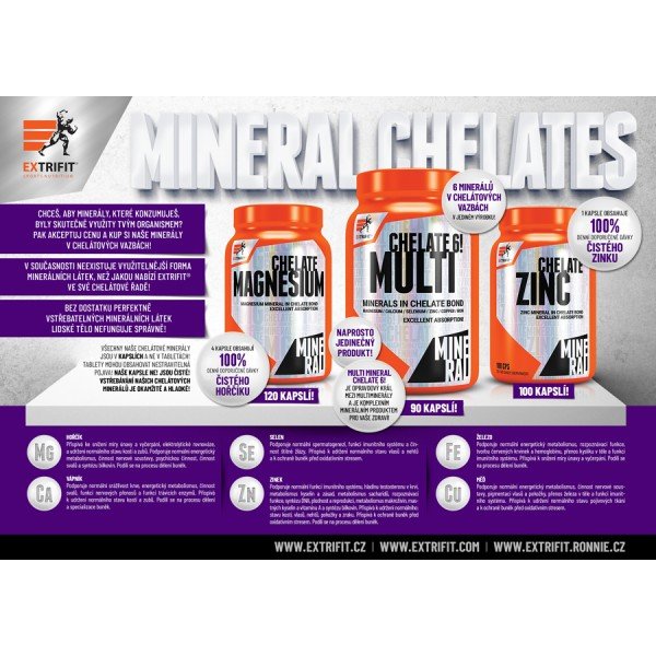 Zinc 100 Chelate obsahuje minerál zinek v chelátové vazbě. Tato forma zinku vyniká nad jinými formami špičkovou vstřebatelností a dokonalou využitelností lidským organismem. Zdrojem zinku v tomto produktu je bisglycinát zinečnatý. Výborná vstřebatelnost chelátové vazby zinku skýtá další velkou výhodu: pro zajištění účinku nemusíte užívat tak vysoké dávky zinku jako u jeho jiných, levných forem! Dávka až na 100 dní!