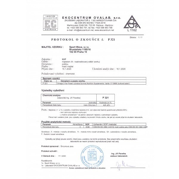 Podle nám dostupných informací je Survival jediný výrobce na tuzemském trhu, který má laboratorně ověřenou oxidační stabilitu tobolek s obsahem omega 3! Proč je klíčové tento ukazatel ověřovat? Jakýkoliv doplněk stravy s obsahem omega 3 mastných kyselin má tendenci oxidovat („žluknout“), protože zmíněné mastné kyseliny jsou velmi náchylné na kyslík. Zoxidovaný produkt pak výrazně ztrácí na kvalitě (snižuje se jeho pozitivní účinek), a tak se mnohdy může stát, že si koupíte omega 3 kyseliny, jejichž účinek je mizivý, nebo dokonce v případě vysoké oxidace jsou jeho účinky na zdraví negativní. Rozhodně tedy neplatí, že „je jedno, jaké omega 3 koupím, protože jsou všechny stejné“ - ani zdaleka! Laboratorní rozbory potvrdily, že průměrná hodnota oxidační stability Omega 3 Fair Power značky Survival je 4,55 mEq O2/kg, což je extrémně nízká hodnota na produkt s tak vysokým obsahem omega 3 mastných kyselin a Vy tak máte absolutní garanci, že používáte produkt s nejvyšší možnou kvalitou a nejvyššími účinky na organismus. Pro zajímavost dodejme, že Mezinárodní organizace pro omega 3 mastné kyseliny EPA a DHA (GOED) doporučuje maximální hodnotu 5 mEq O2/kg1. Tento limit však dle dostupných studií nesplňuje mnoho produktů napříč celosvětovým trhem2, nejhorší vzorky měly 15x vyšší hodnotu než produkt Survivalu, v průměru se ale hodnoty u produktů, které překračují doporučené hodnoty, pohybují napříč studiemi na úrovni 2-4krát vyšší. To vše svědčí o vynikající kvalitě Omega 3 Fair Power.