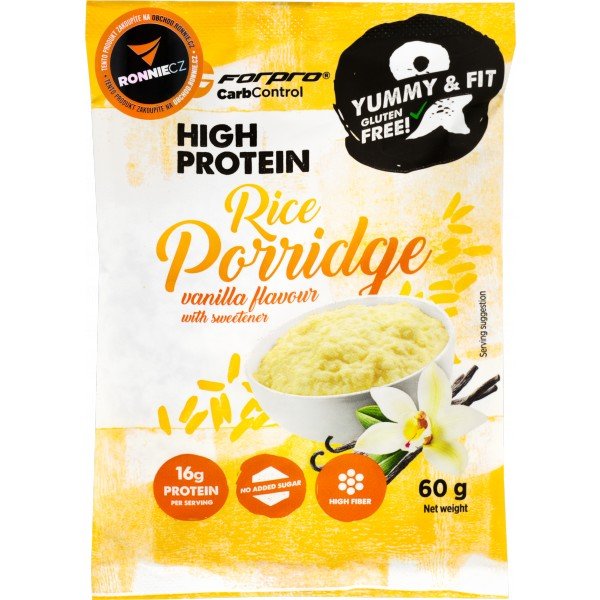 Proteinová rýžová kaše ForPro® High Protein Rice Porridge je rychlou a lahodnou svačinkou s vysokým obsahem kvalitních syrovátkových bílkovin s velmi nízkým obsahem cukru. Neobsahuje umělá barviva ani konzervační látky. Je jedním z nejzdravějších a nejchutnějších způsobů, jak začít den. Vysoký obsah vlákniny může zabránit neodbytným chutím mezi jídly. [o-znacce-forpro] [soutez-forpro]