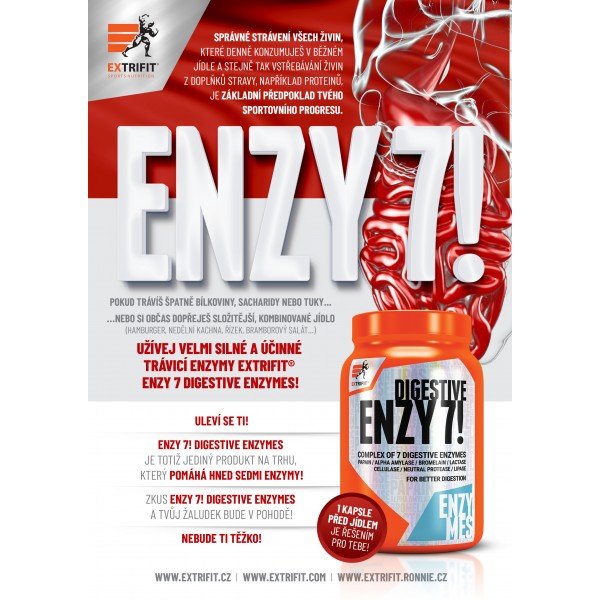 Vynikající pomocník pro dokonalé trávení všech živin. Bílkovin, sacharidů i tuků. Enzy 7! Digestive Enzymes je naprosto unikátní a nejúčinnější produkt svého druhu. Tento výrobek Vás zbaví zažívacích obtíží. Obsahuje komplex 7 trávicích enzymů pro lepší trávení bílkovin, sacharidů a tuků. Obsahuje enzymy papain, alfa-amylázu (Aspergillus oryzae), bromelain, laktázu (Aspergillus oryzae), celulázu (Trichoderma reesei), neutrální proteázu (Bacillus licheniformis) a lipázu (Aspergillus aryzae).