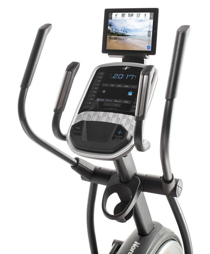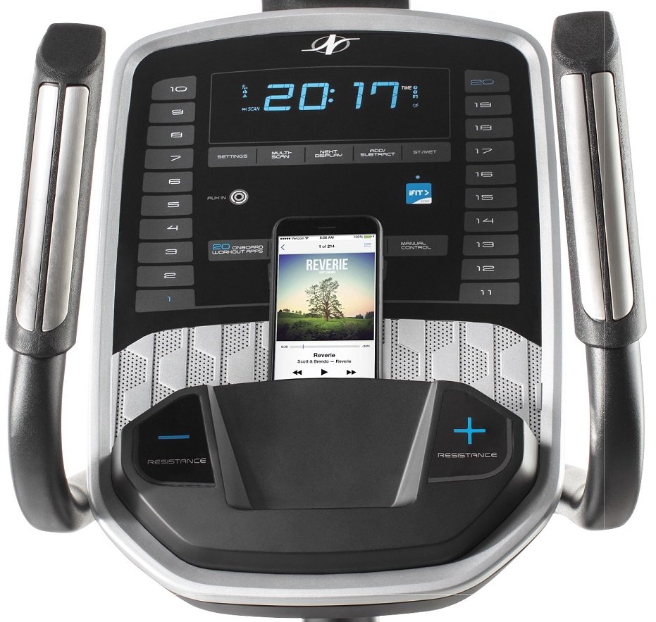 Eliptický trenažér NORDICTRACK C5.5 má multifunkční podsvícený 5" LCD displej s nastavitelným držákem na tablet, který se snadno ovládá a zobrazuje všechny běžné hodnoty tréninku. Vyobrazené parametry na displeji jsou: čas, rychlost, vzdálenost, spálené kalorie a tepovou frekvenci (pomocí dlaňových snímačů, či hrudního BLUETOOTH pásu, který není součástí balení). Z programové nabídky má 20 přednastavených programů pro spalování tuku, zvyšování tělesné kondice apod. Rukojeti mají integrovaná madla pro měření tepové frekvence a možnost připojení hrudního pásu přes bluetooth. Stroj disponuje 2 zabudovanými reproduktory s možností připojení MP3 přehrávače nebo smartphonu. Součástí stroje je držák na tablet, který využijete pro tréninkovou aplikaci nebo sledování filmů při maximální komfort při tréninku. Tablet není součástí dodávky.