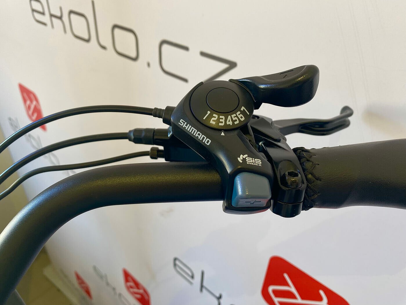 Kožené gripy s područkou. Na levém držadle je dálkové ovládání displeje, na pravém řazení 7 rychlostí (Shimano RDTY300D) s přehazováním palcovou páčkou. Kotoučové hydraulické brzdy Clarks - přední i zadní průměr kotouče 160 mm, dvou-pístkové, páka na dva prsty. Masivní postranní stojan na levé straně.