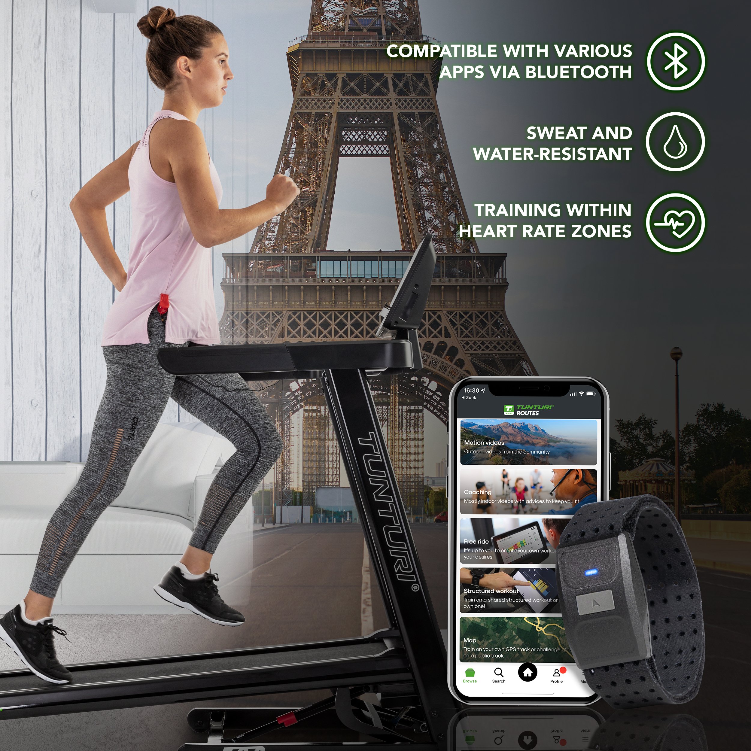 Pásek na ruku s měřením tepové frekvence je kompatibilní s hlavními fitness aplikacemi, jako jsou Tunturi Routes, Tunturi Training, Kinomap, Zwift a Strava. Snímač funguje se všemi fitness zařízeními, chytrými hodinkami (GPS) a cyklistickými počítači s připojením Bluetooth nebo ANT+. Snímač tepové frekvence na paži je vhodný i pro plavce: je vodotěsný až po dobu třiceti minut v maximální hloubce jednoho metru.