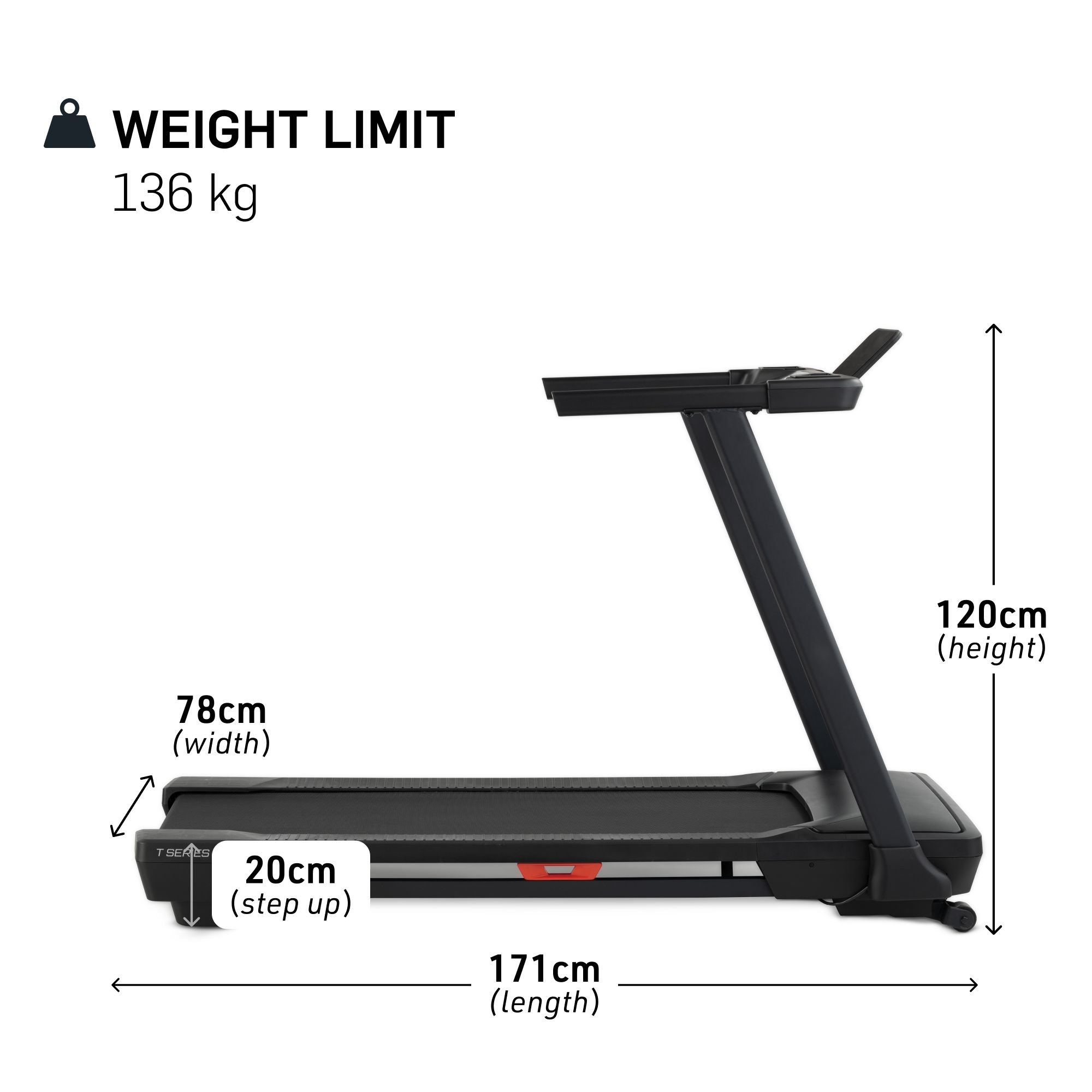 Neuvěřitelně široká a dlouhá běžecká plocha o rozměrech 46x140 cm zaručuje bezpečný běh nebo chůzi. Vysokou hmotnost uživatele až 136 kg zajišťuje pevná a odolná konstrukce pásu. Užijte si svou oblíbenou hudbu s integrovanými reproduktory ,výhodou je také konektivita sluchátek Bluetooth® a využijte pro pitný režim 2 držáky na nápoje..Po skončení tréninku běžeckou desku snadno zvednete a převezete, abyste maximálně využili prostor v místnosti.